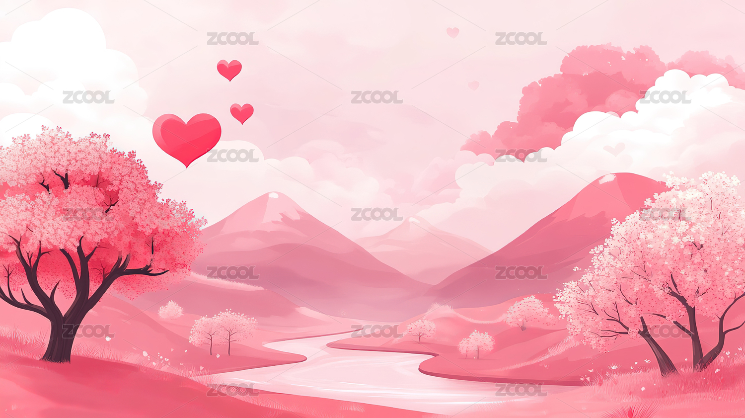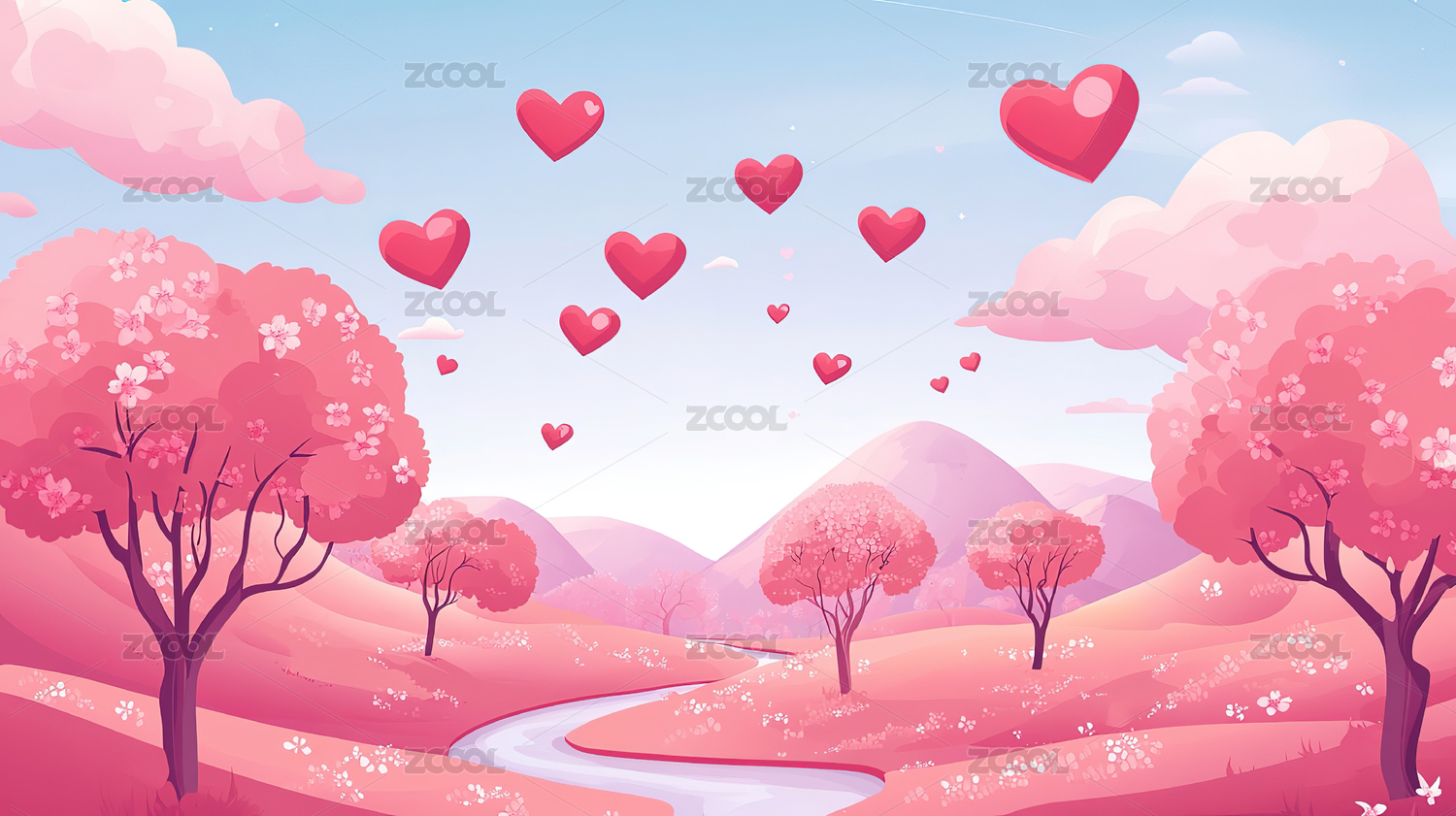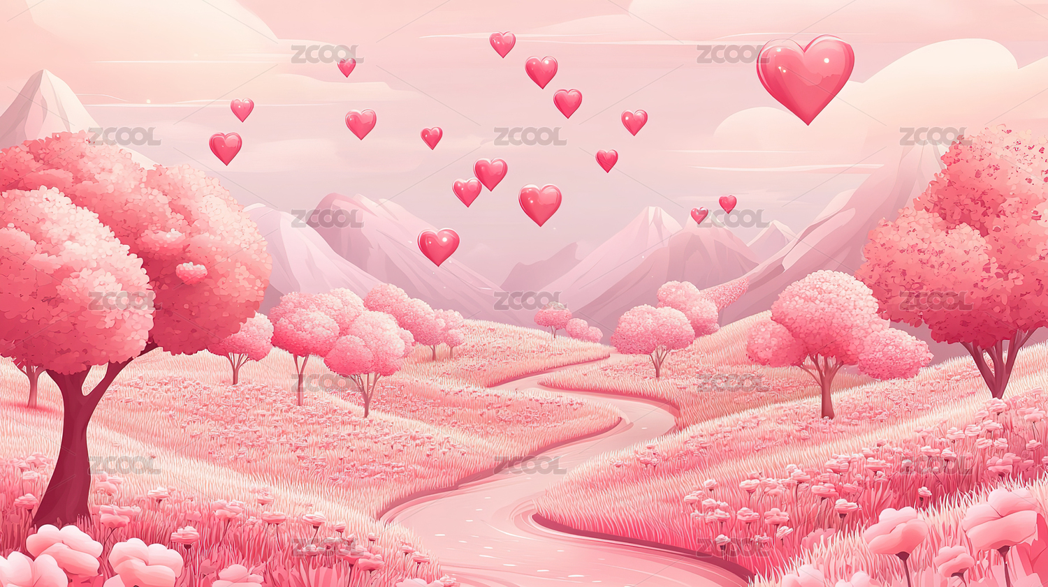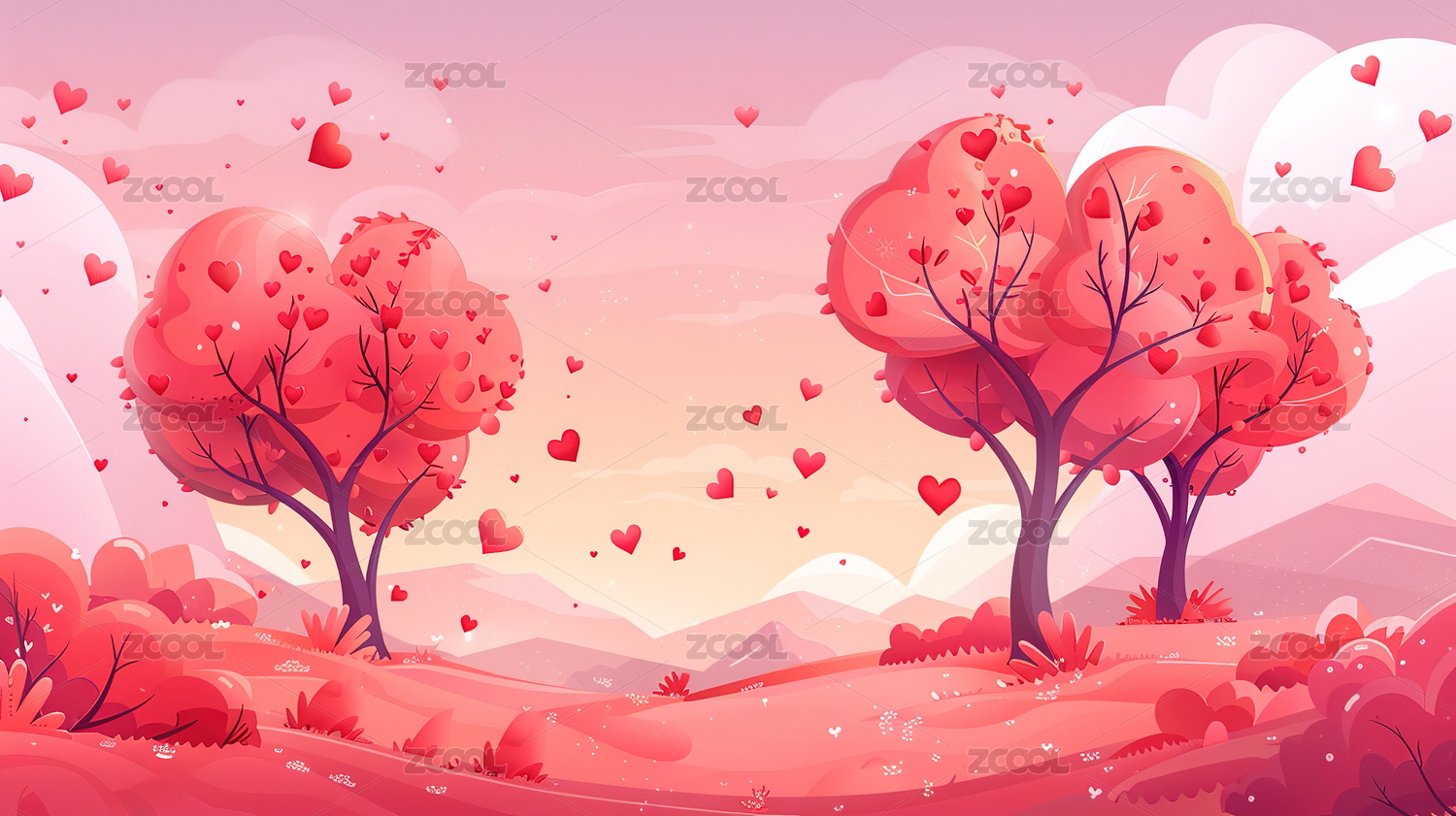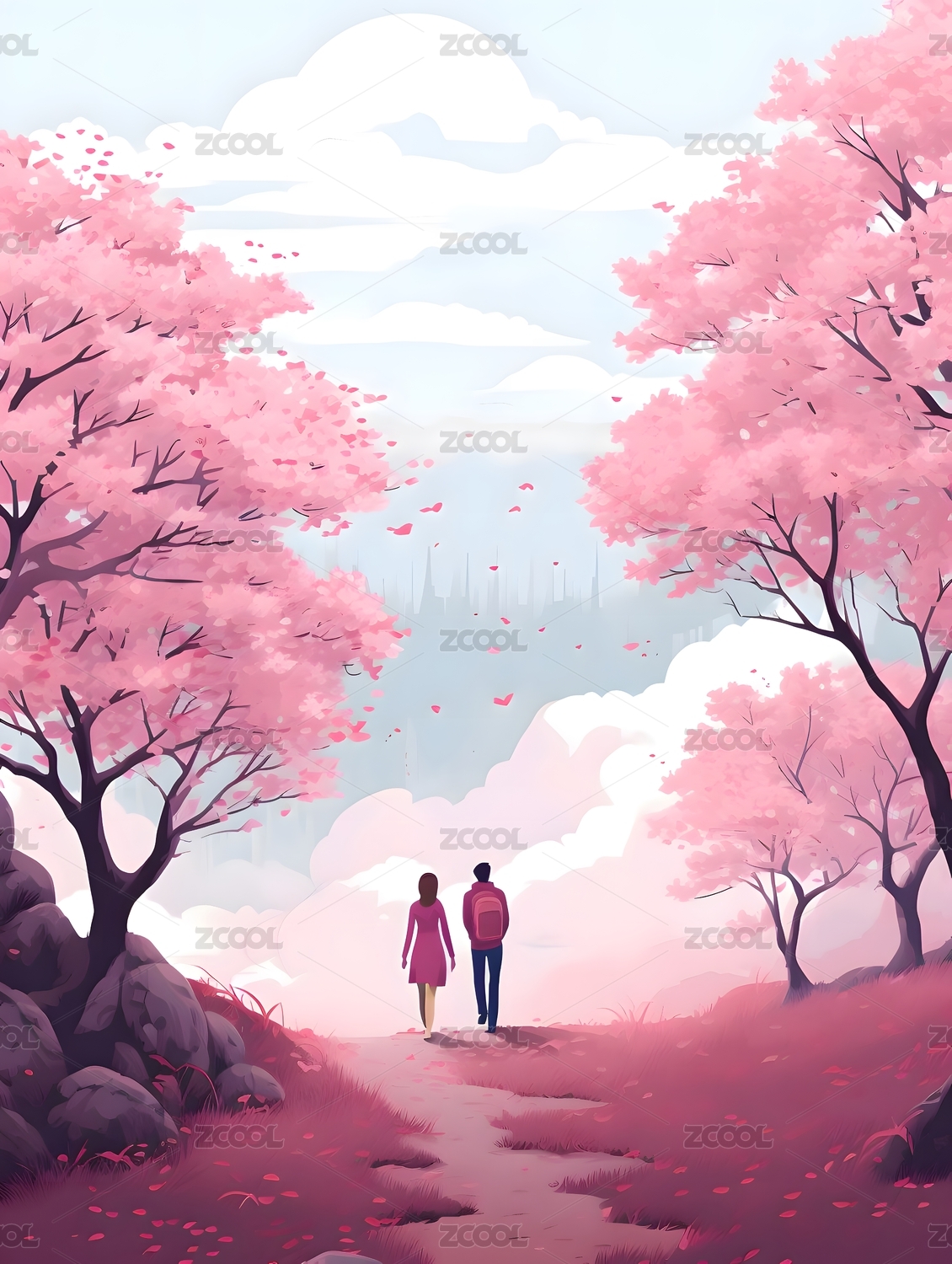 情人节粉色海报插画情侣走在林荫路上