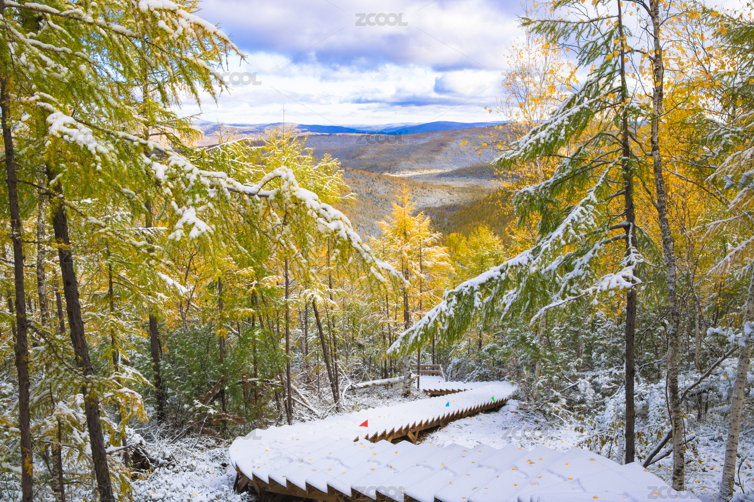 中国大兴安岭呼中小白山金秋森林中铺满雪的蛇形木栈道