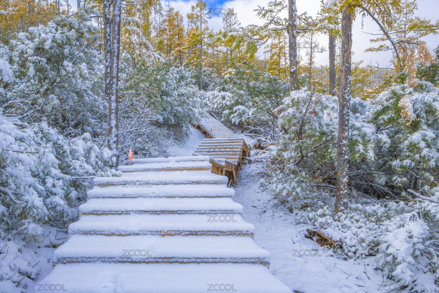 中国大兴安岭林中铺满雪的木台阶