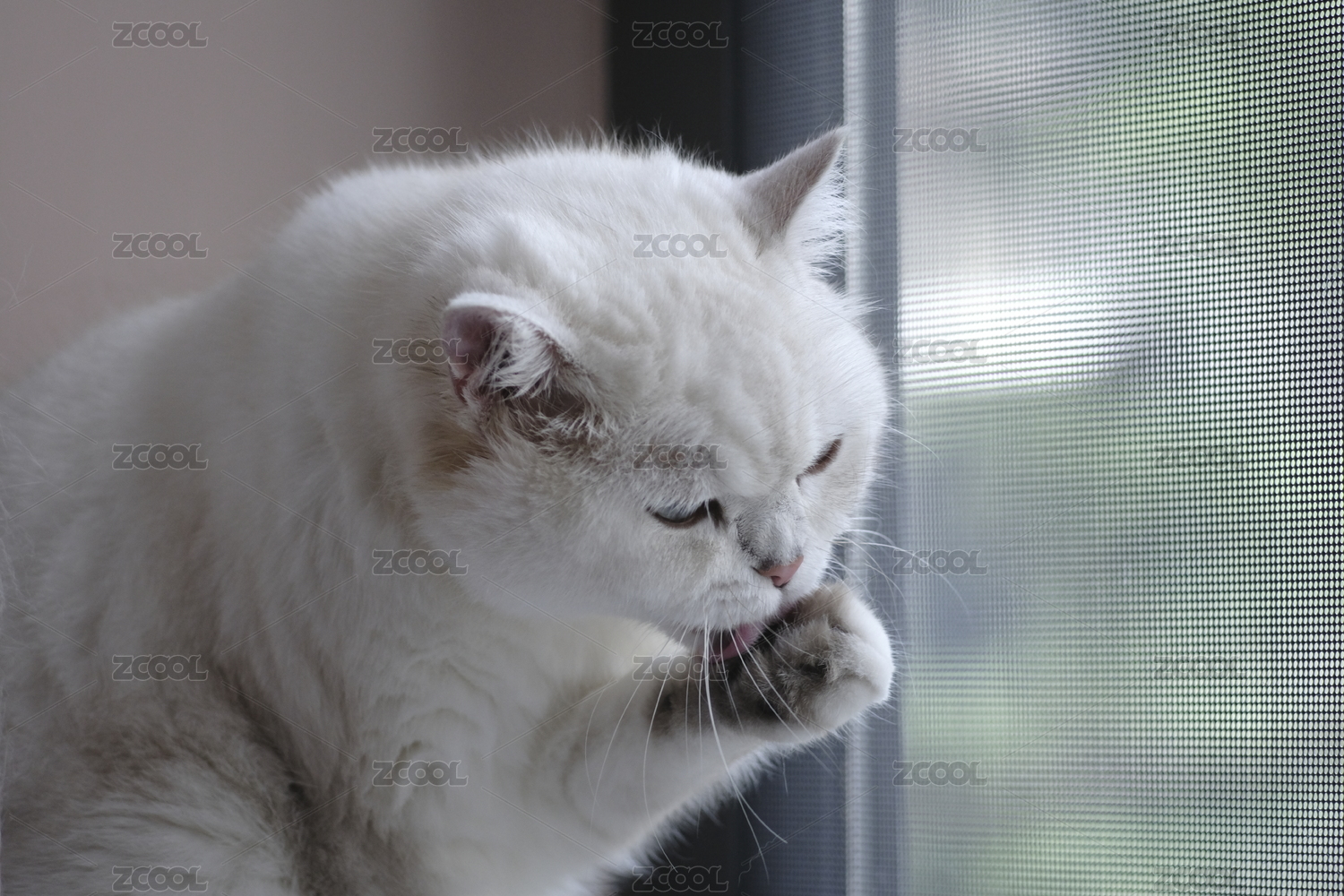 窗台上舔舐爪子的白色小猫