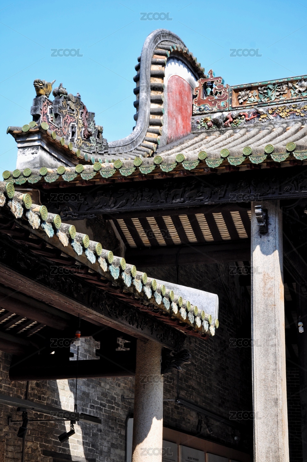 中国广东广州陈家祠,精致雕刻的岭南风格建筑屋顶