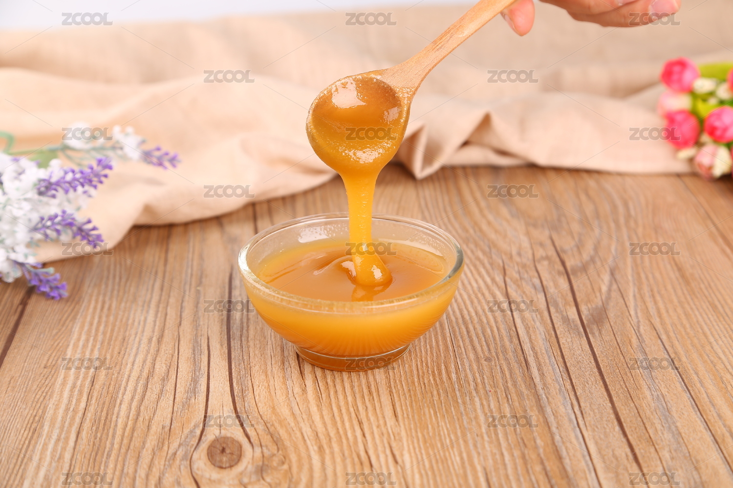 木质纹理上木碗盛放的蜂蜜