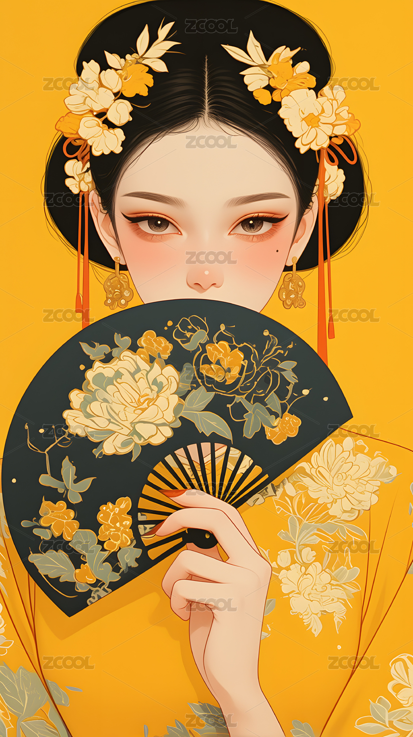 国潮风美女扇子卡通插画