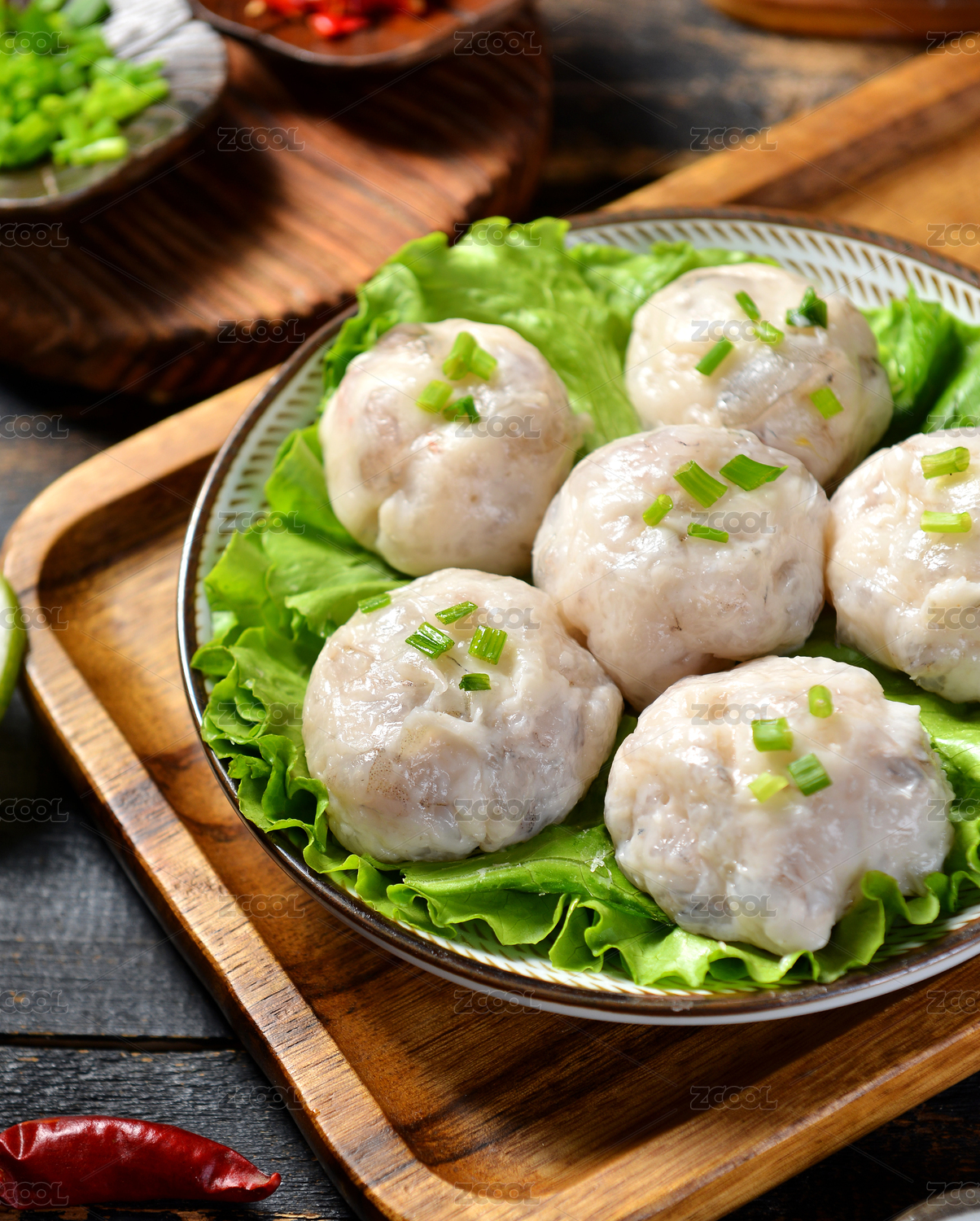 木纹背景上摆放的海鱼肉丸