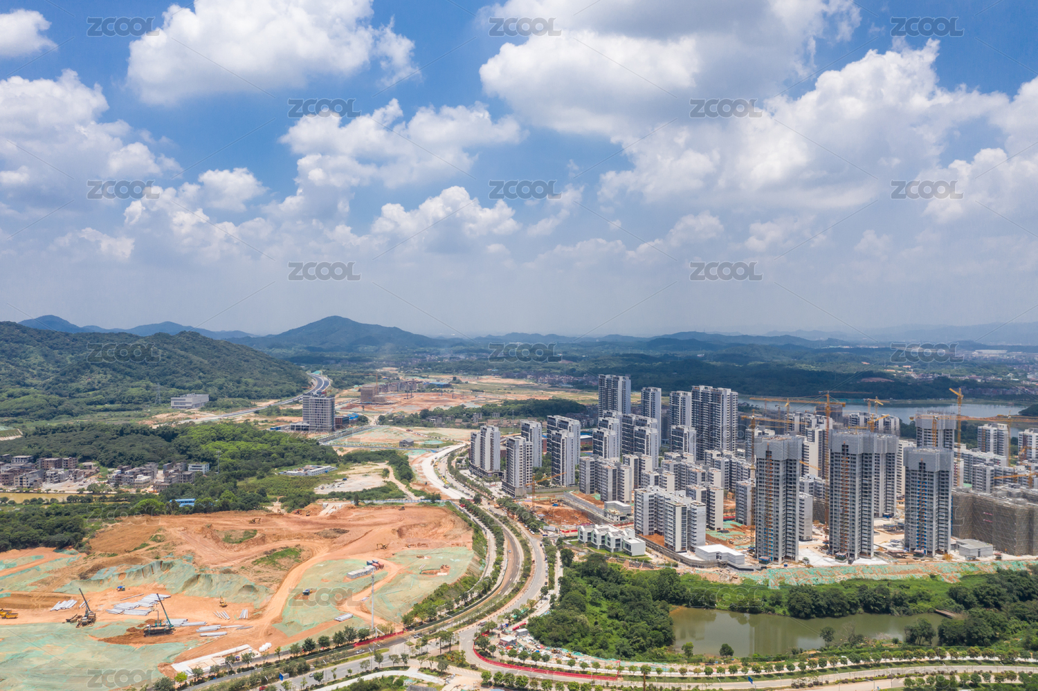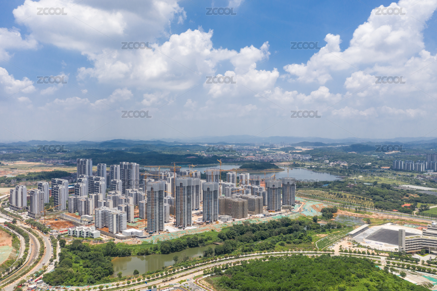 广州萝岗香雪商业建筑群城市天际线航拍全景