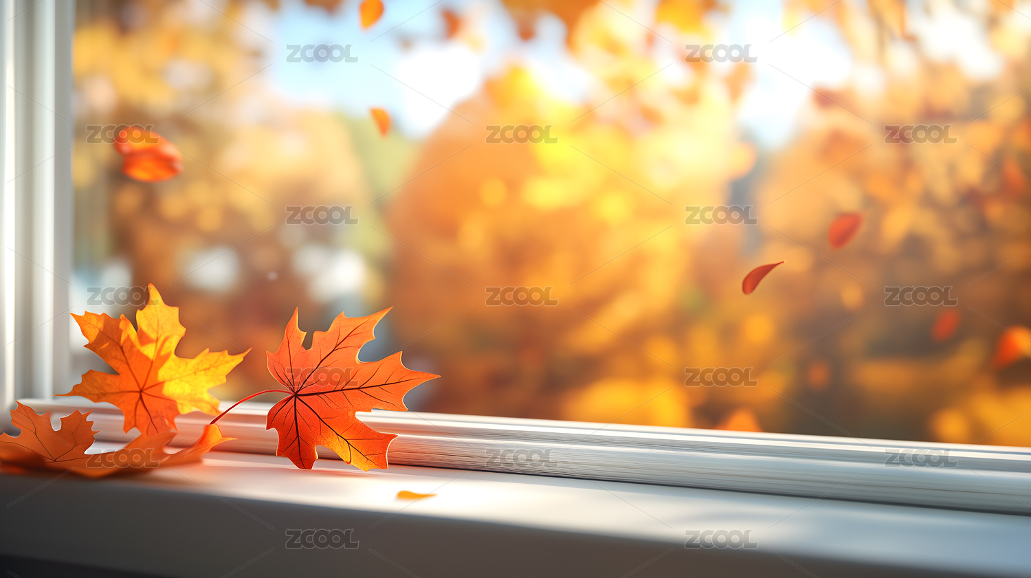 秋日窗景枫叶飘落