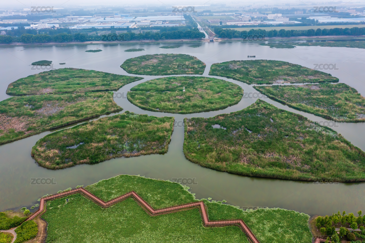 航拍河南平顶山白鹭洲国家城市湿地公园绿意