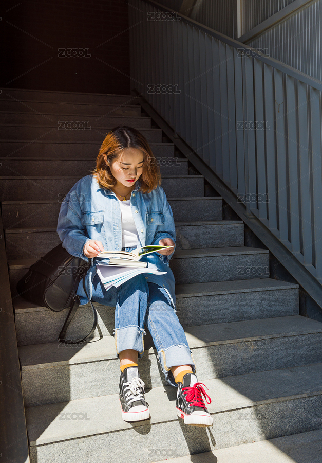 坐在楼梯上的女孩和书