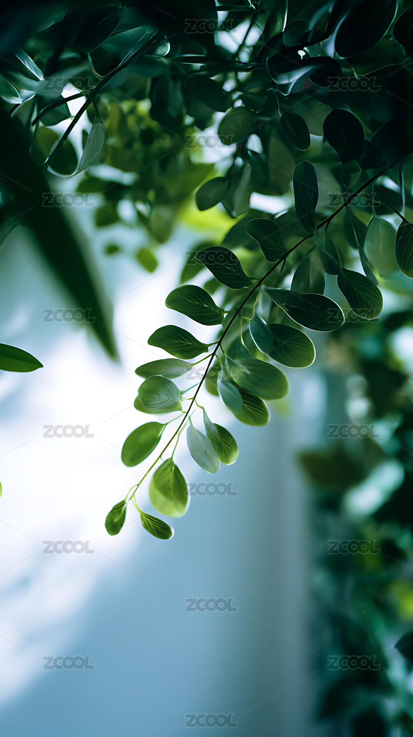 阳光下玻璃瓶中绿色叶子在白墙留下美丽影子