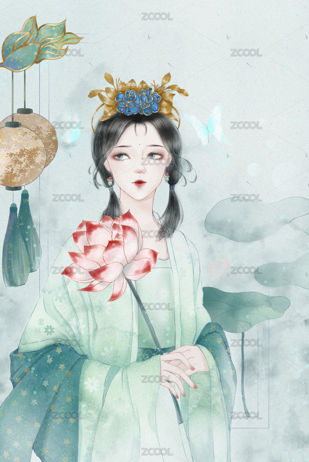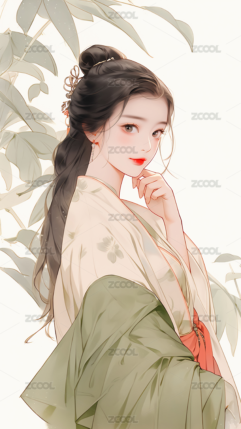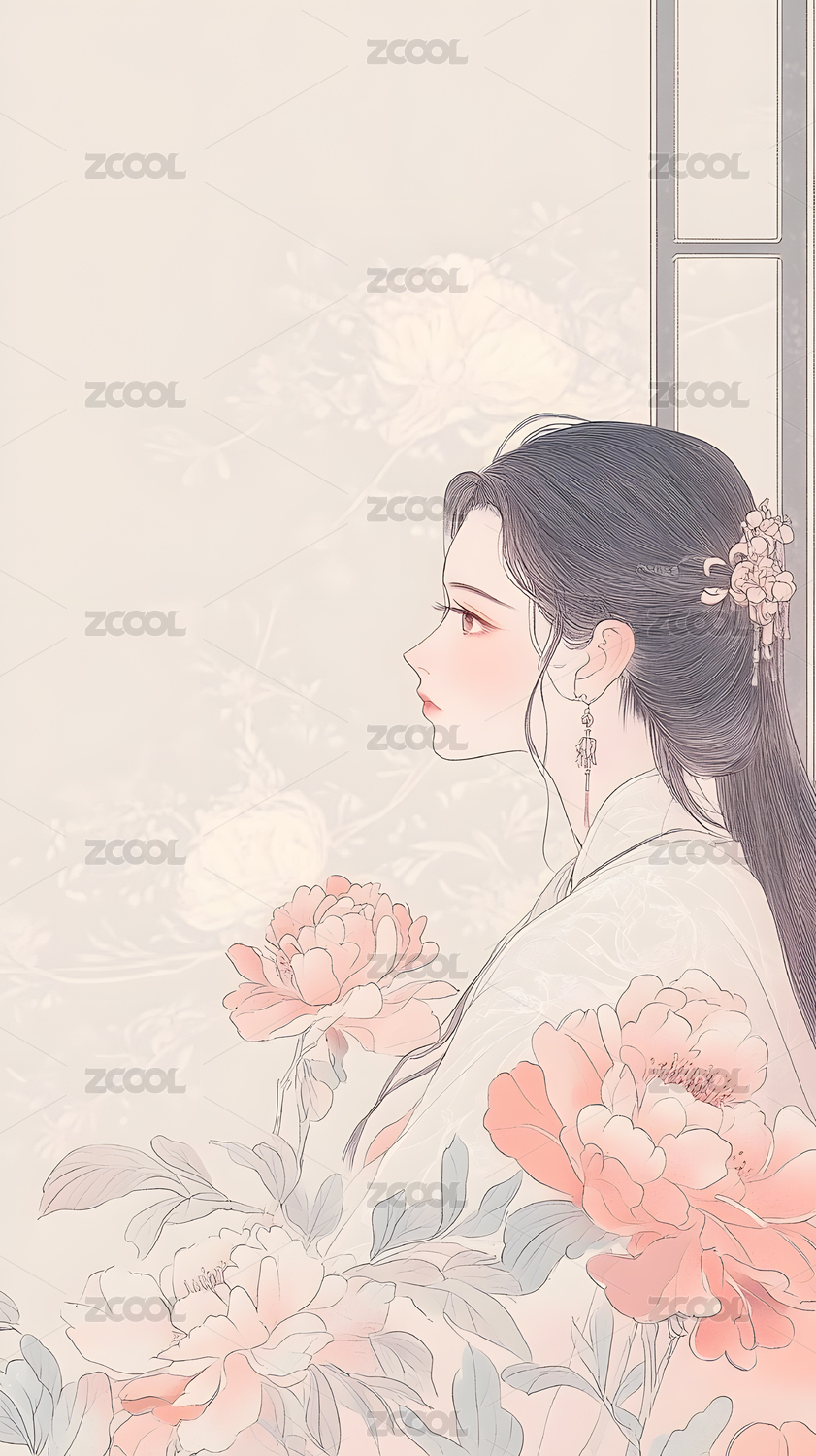水墨风格婉约少女插画