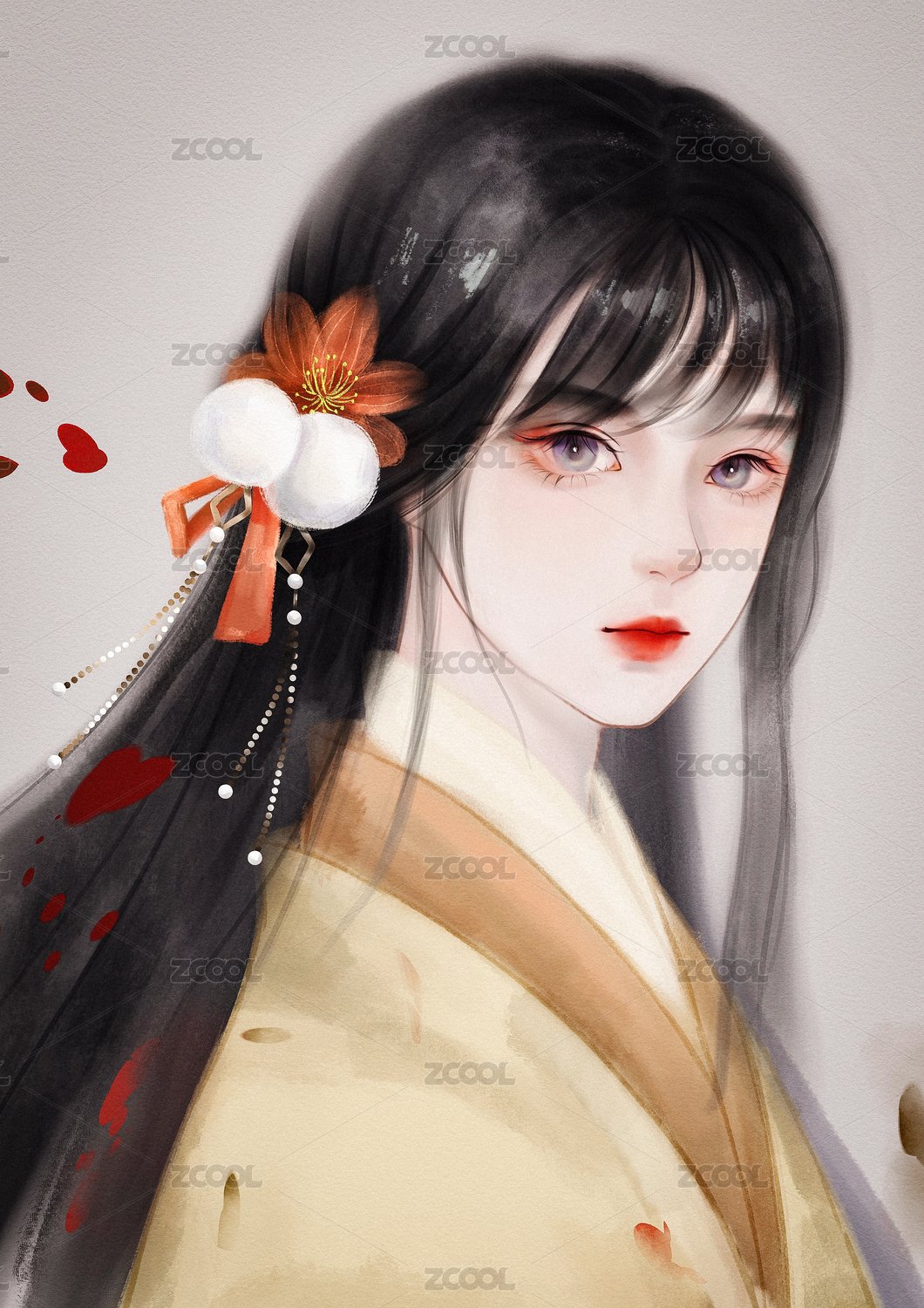 古装,女孩,汉服,美妆,鲜花,雏菊,人物,插画,长发