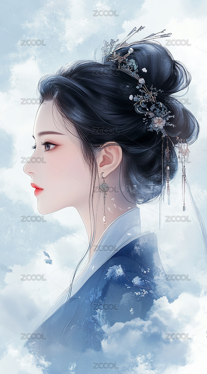 蓝色服饰的古风美女侧脸插画
