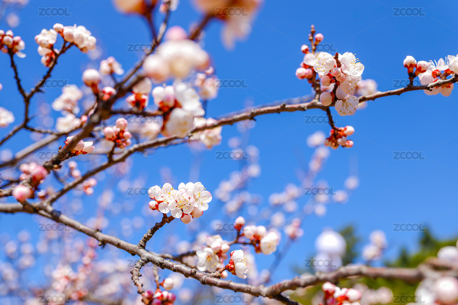 春天蓝天下开满枝条的杏花