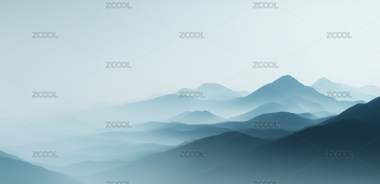 淡蓝背景下群山层叠朦胧展现诗意水墨山水意