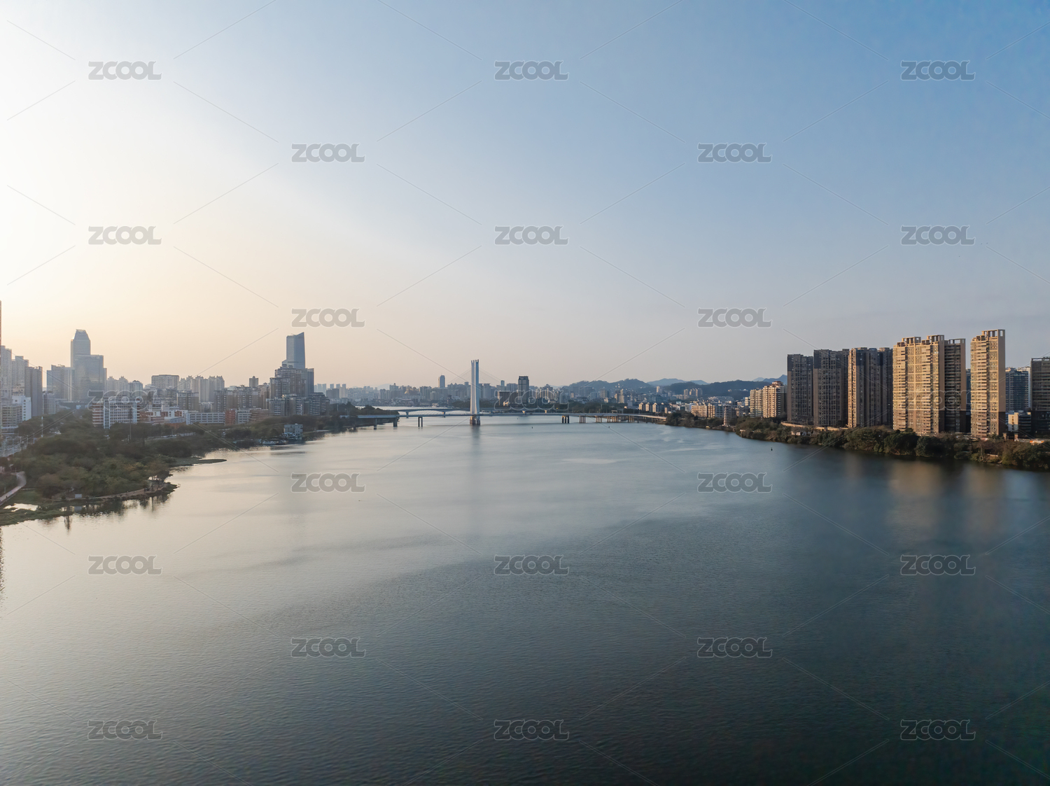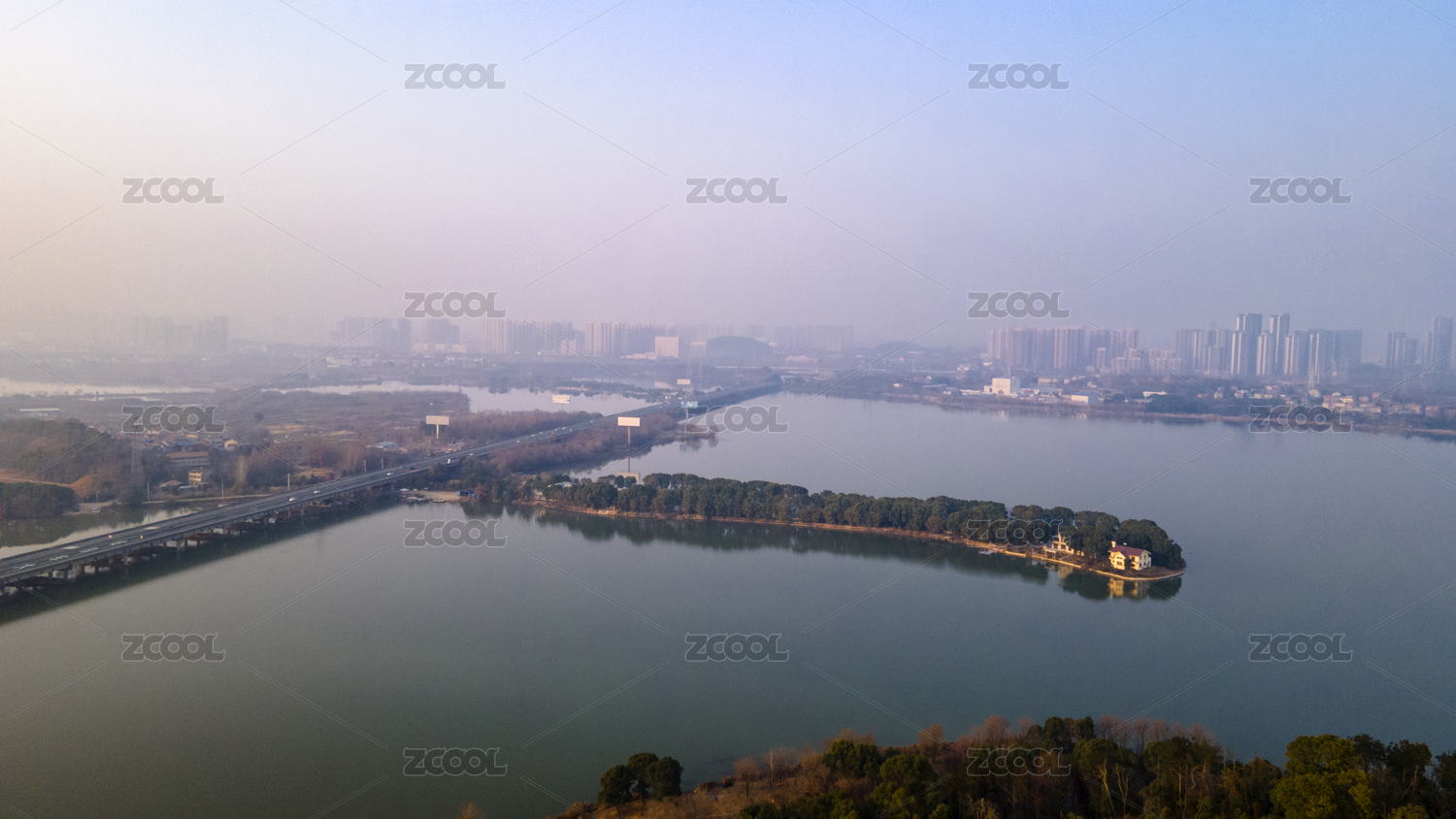 浙江省杭州市湘湖景区秋色晨曦航拍