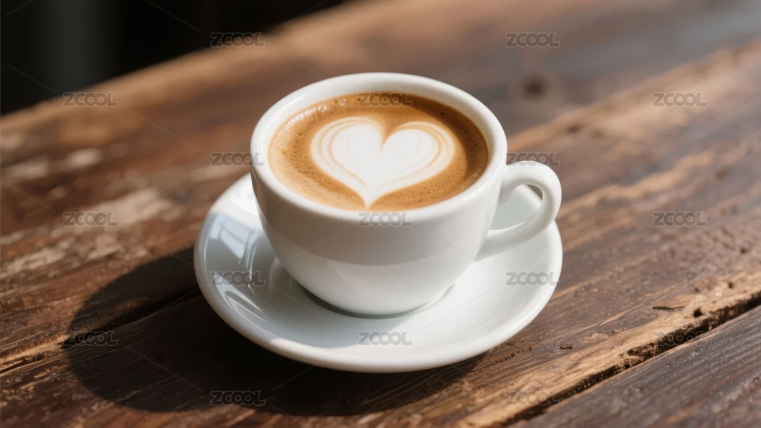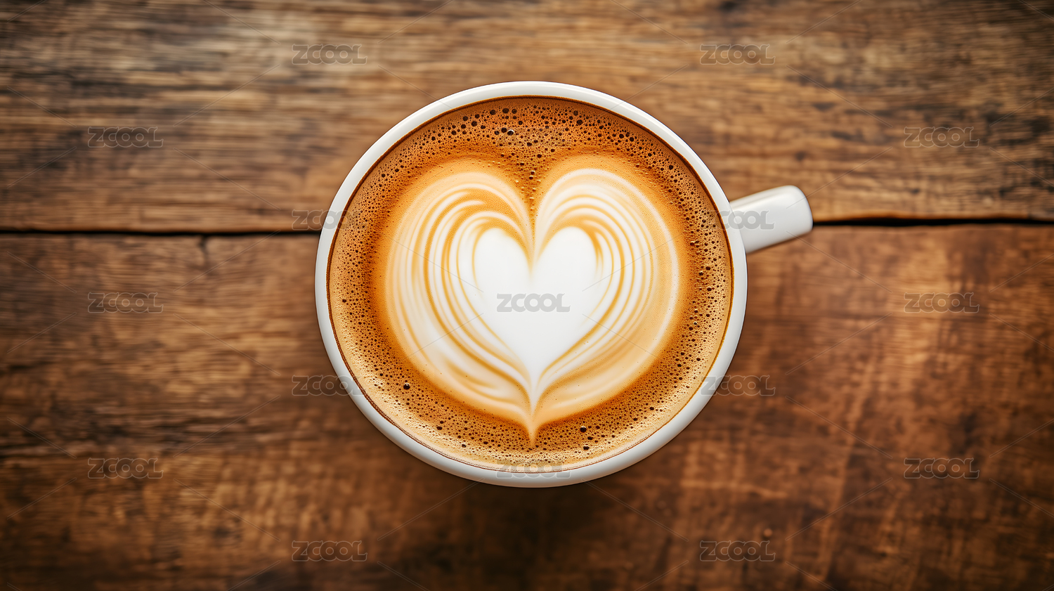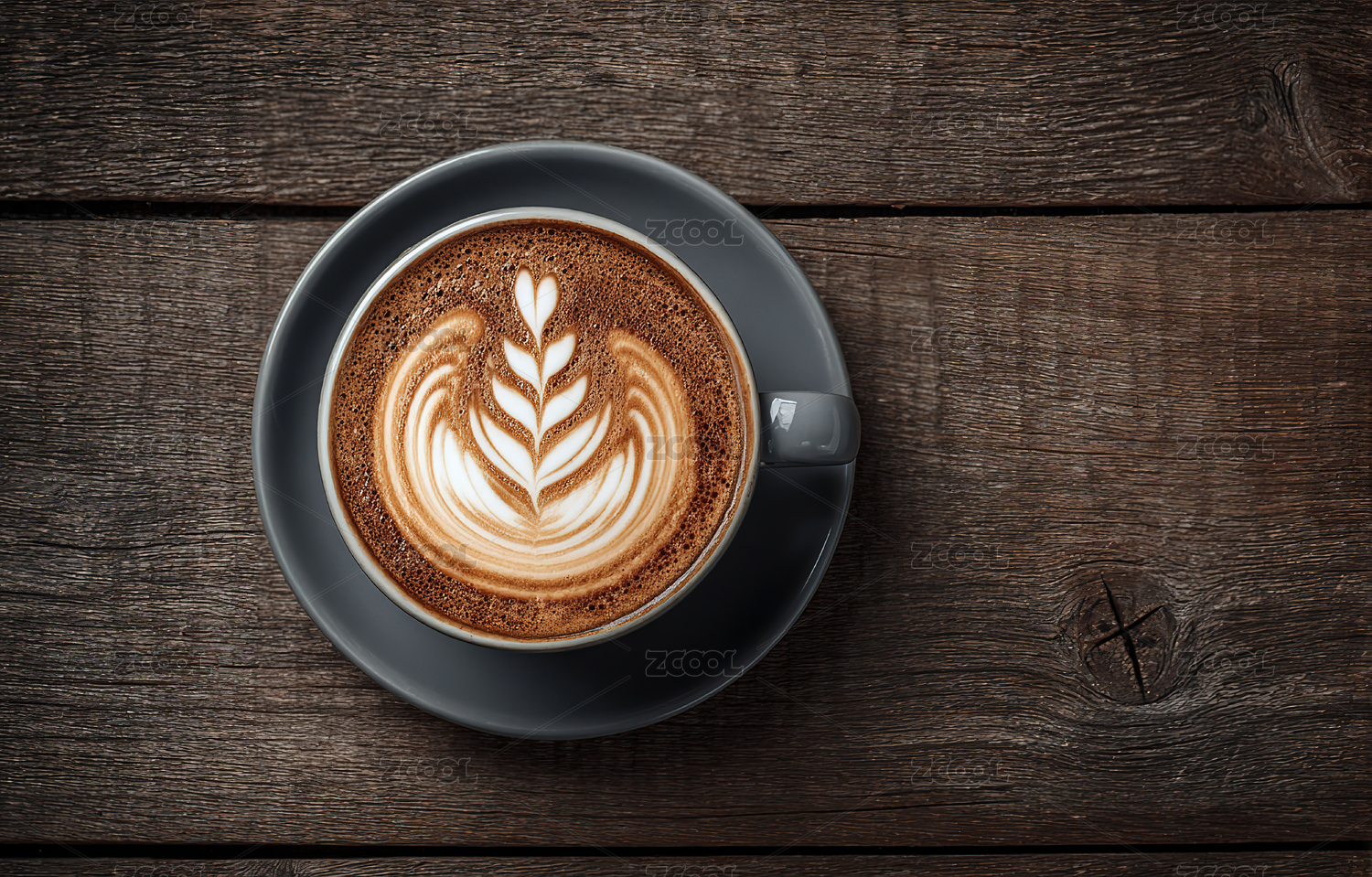 木制桌面上的咖啡拿铁压纹拉花的特写