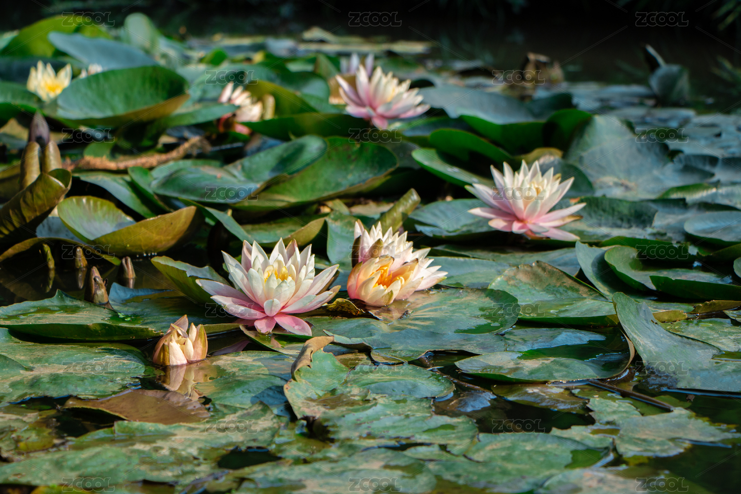 夏天在水潭中盛开的一朵朵莲花