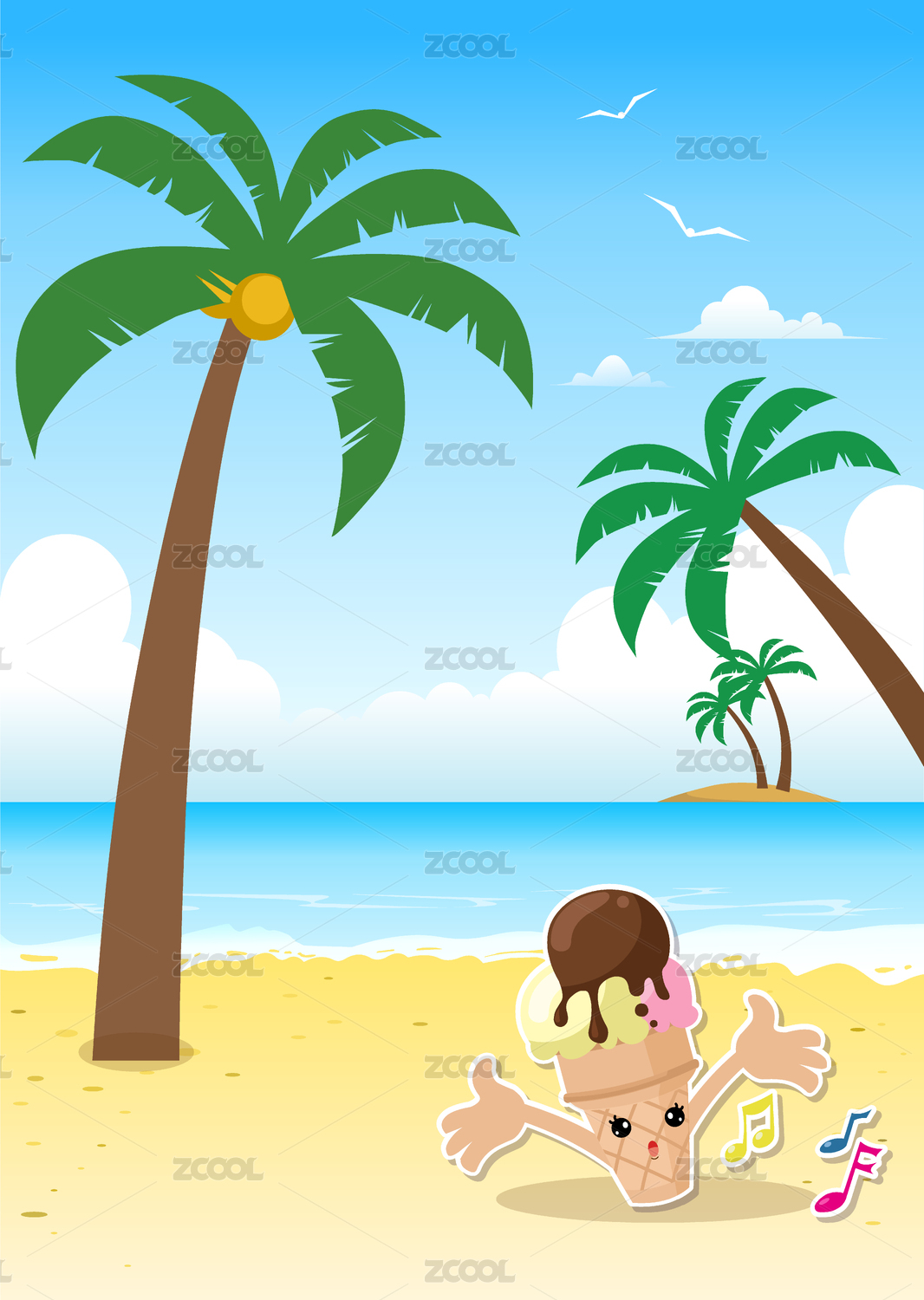 凉爽夏天海边沙滩冰淇淋风景矢量图设计