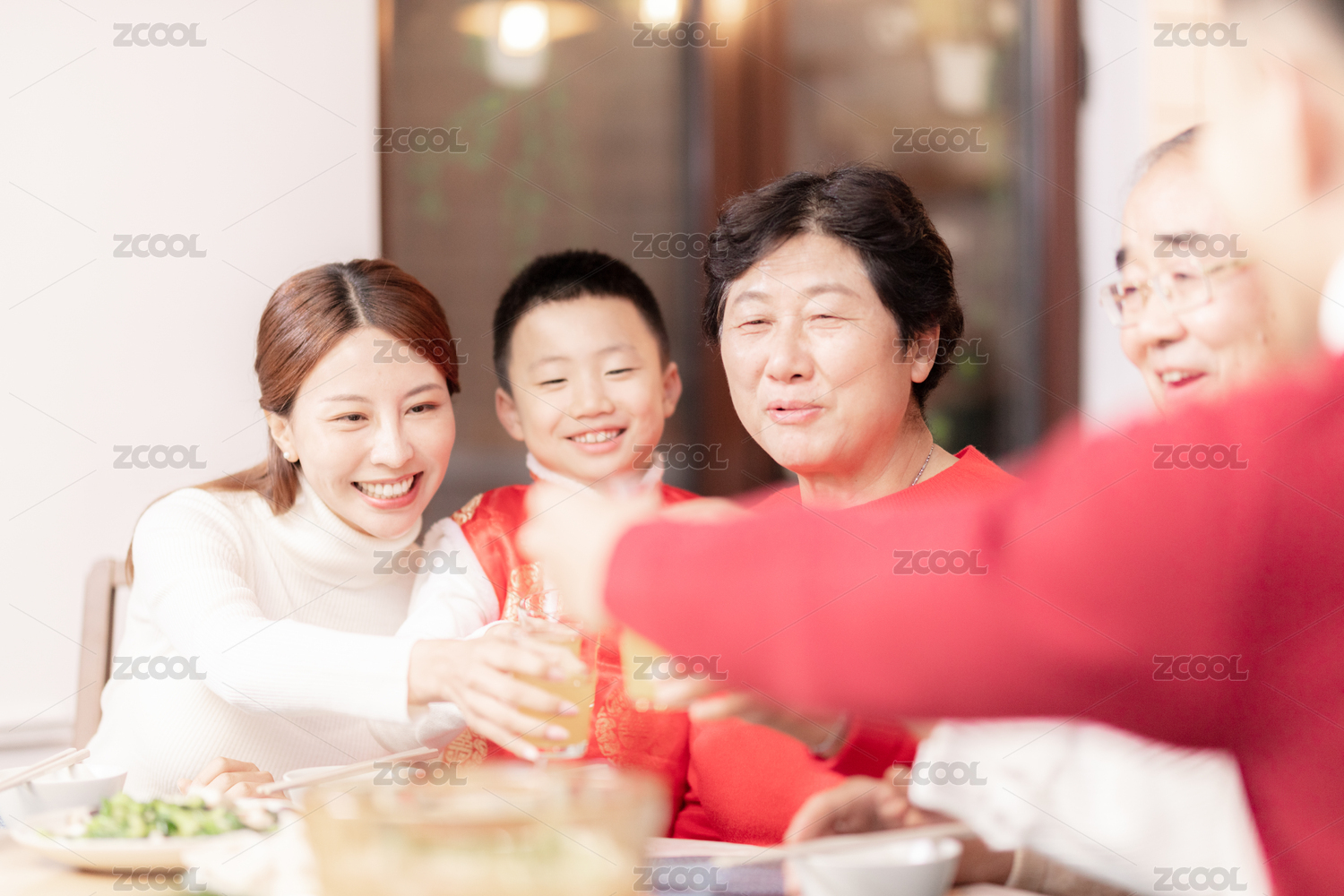祖孙三代在饭桌前举杯庆祝