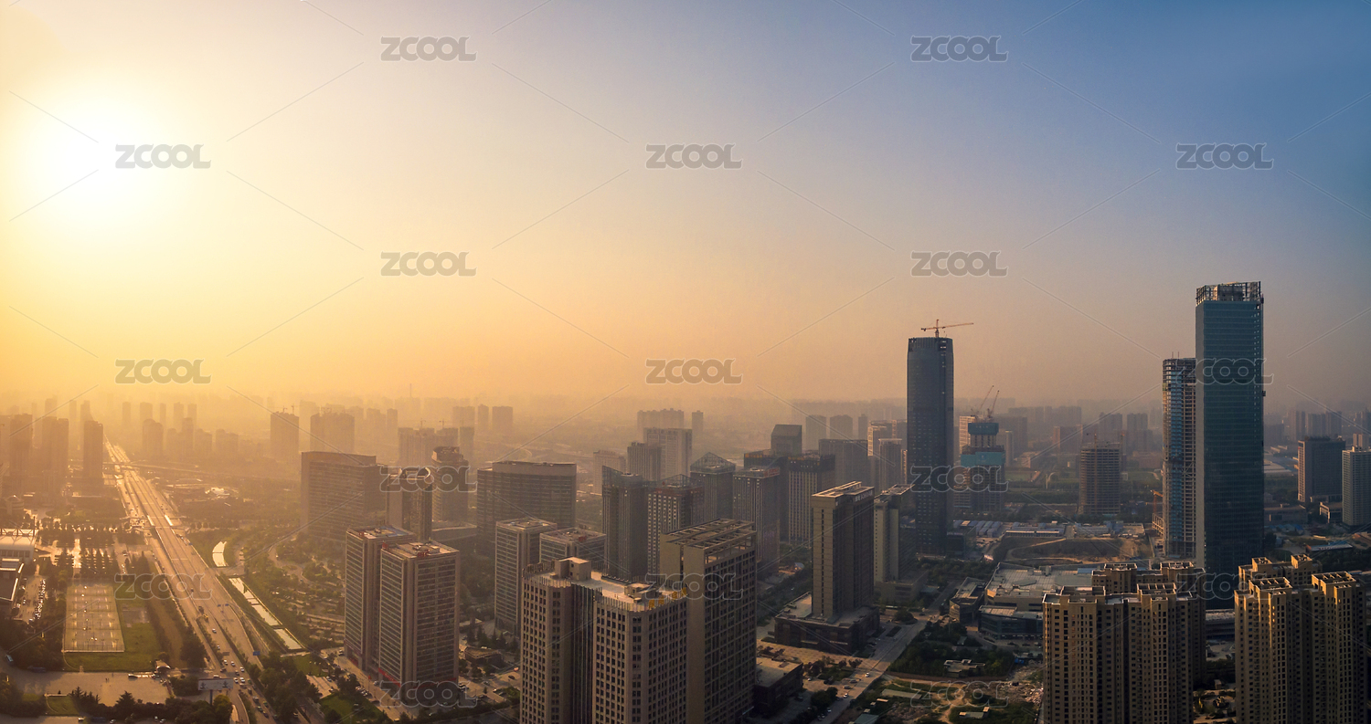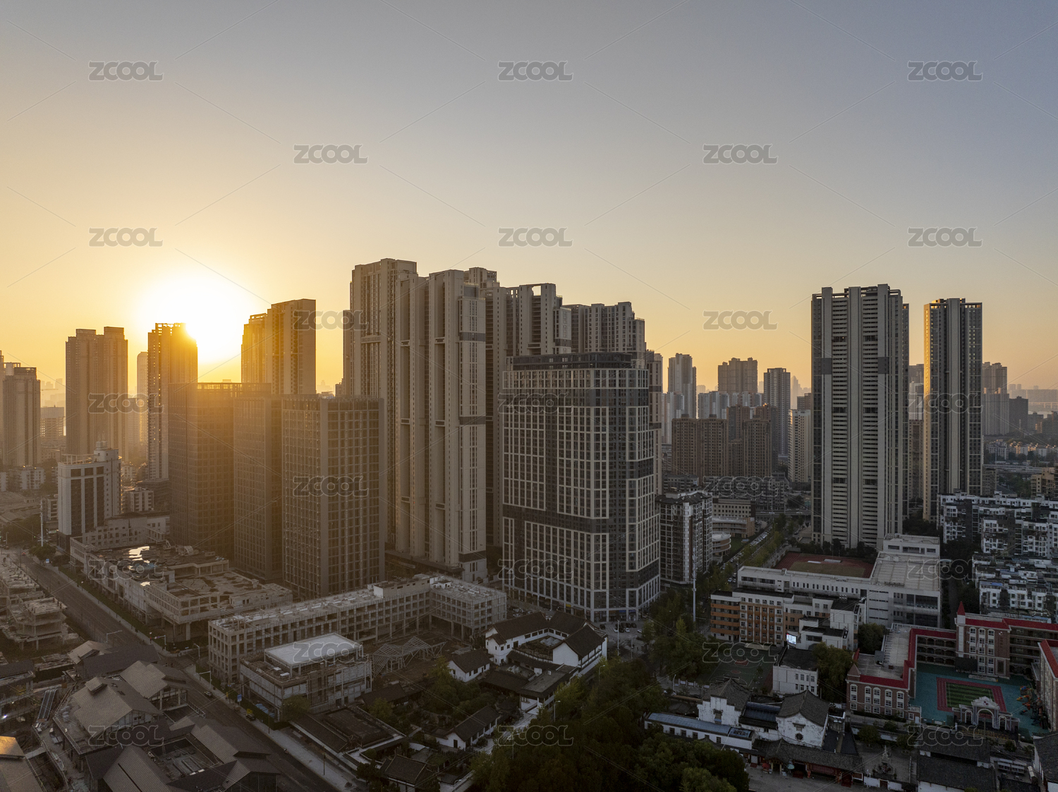 清晨日出前后的杭州滨江城市建筑风景航拍