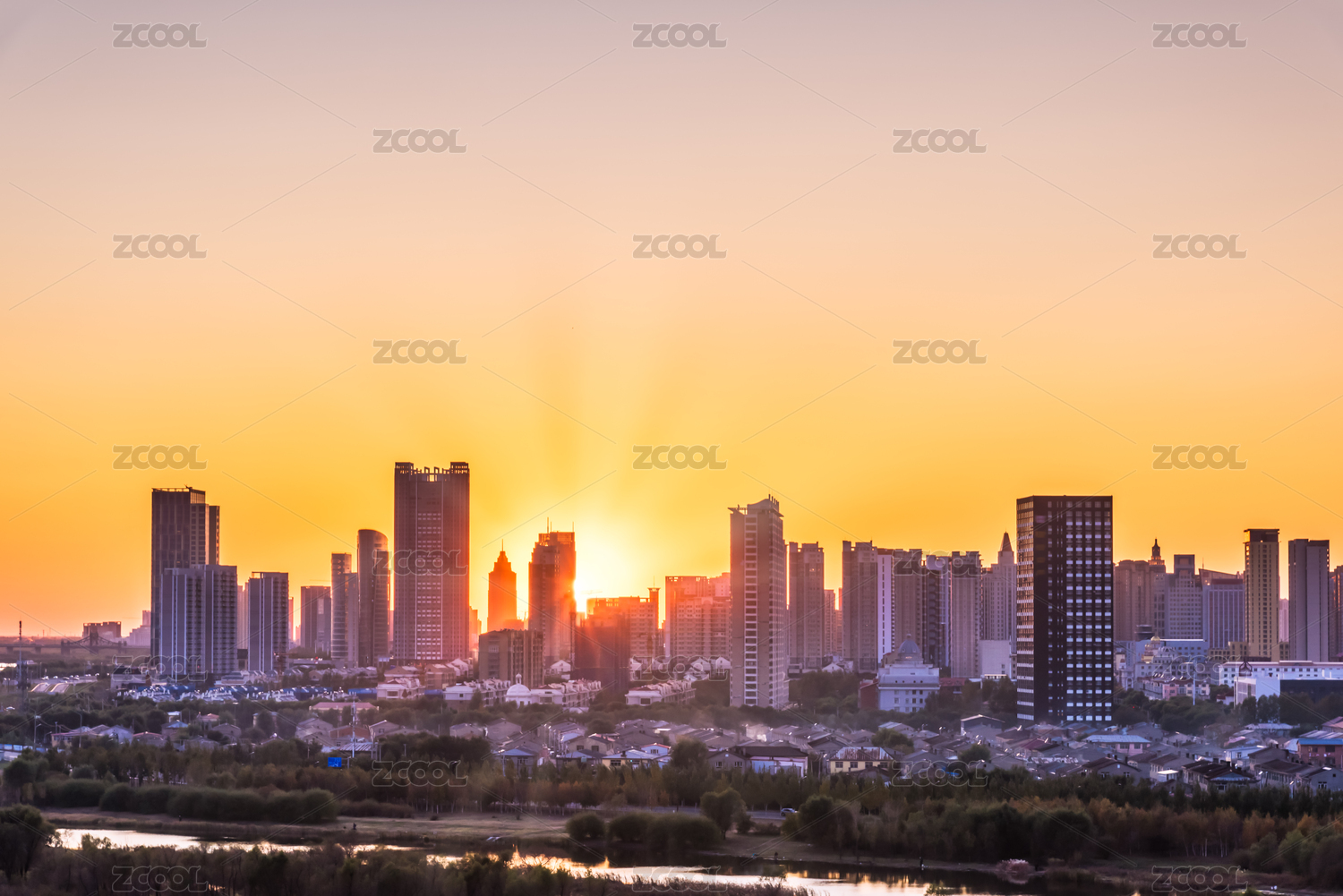 夕阳下的哈尔滨松花江沿岸公园和建筑