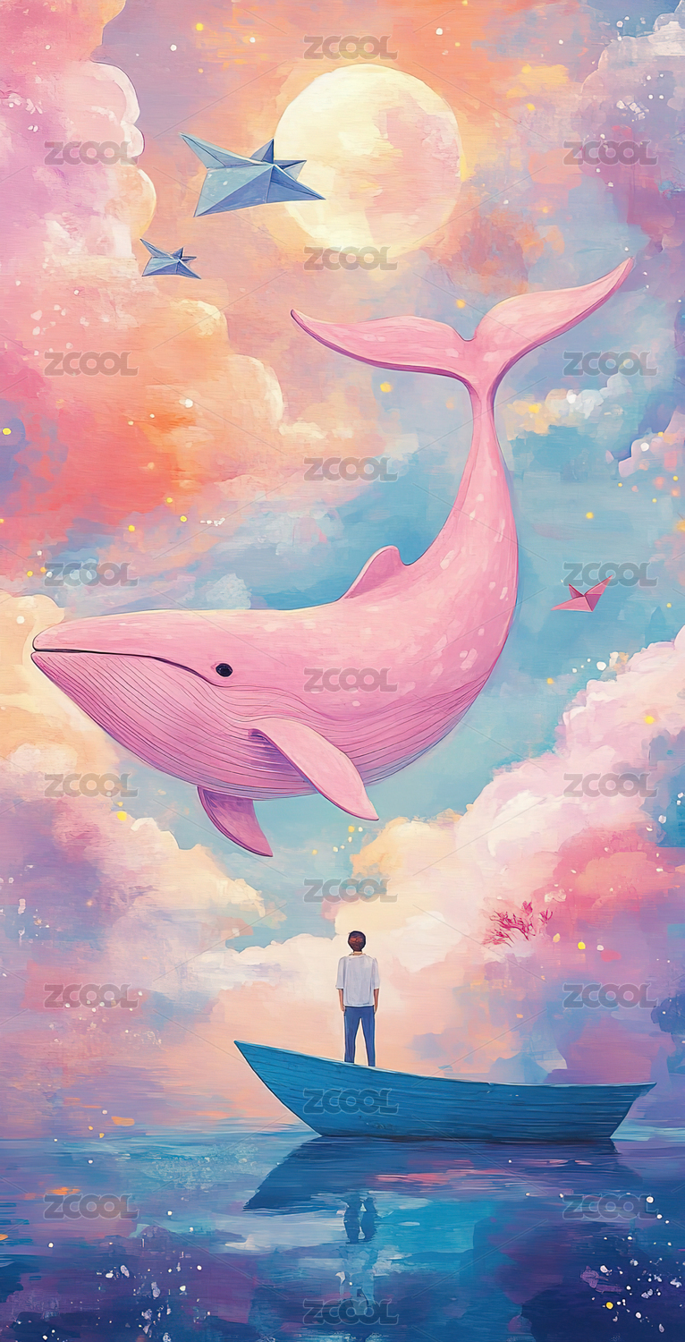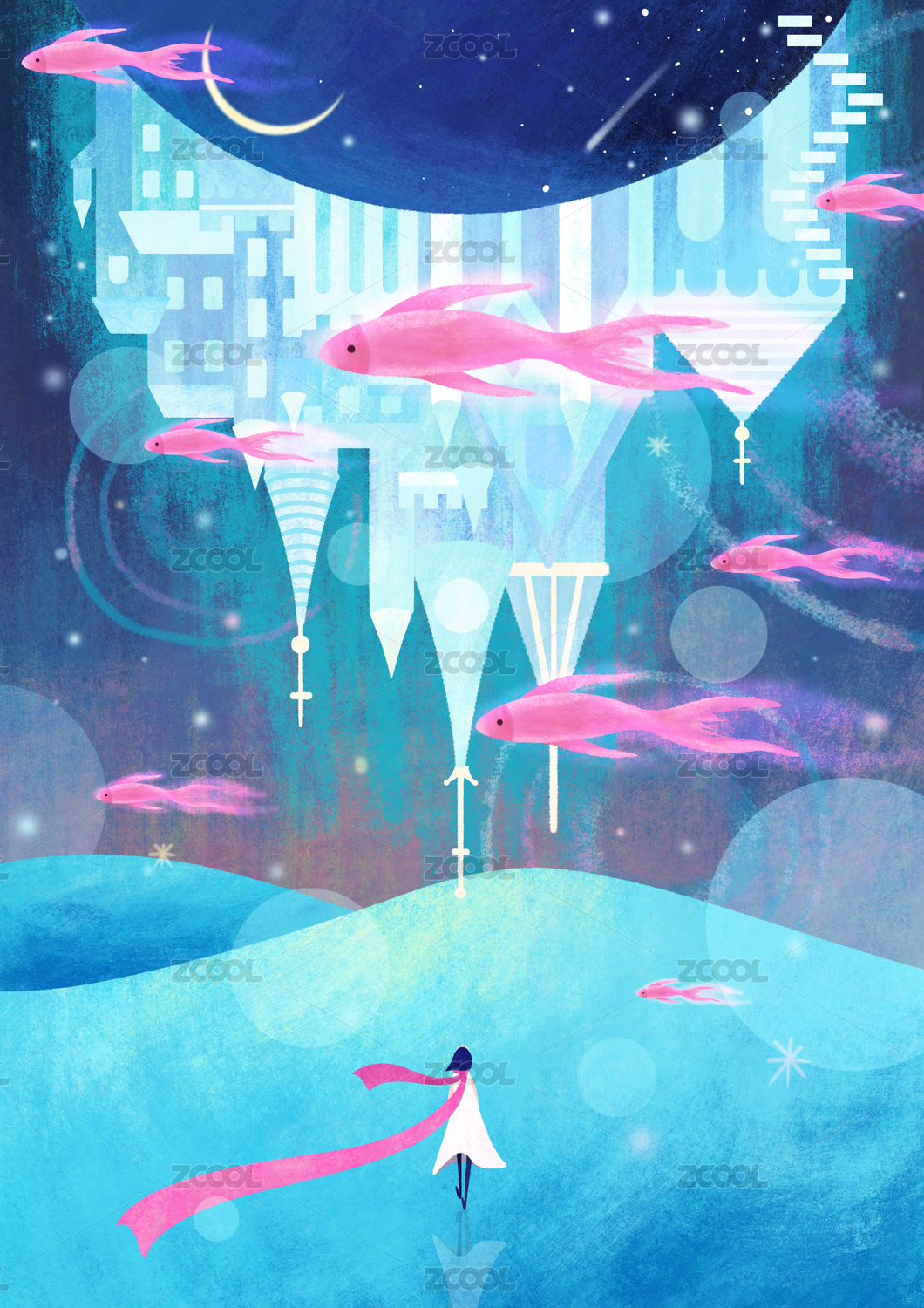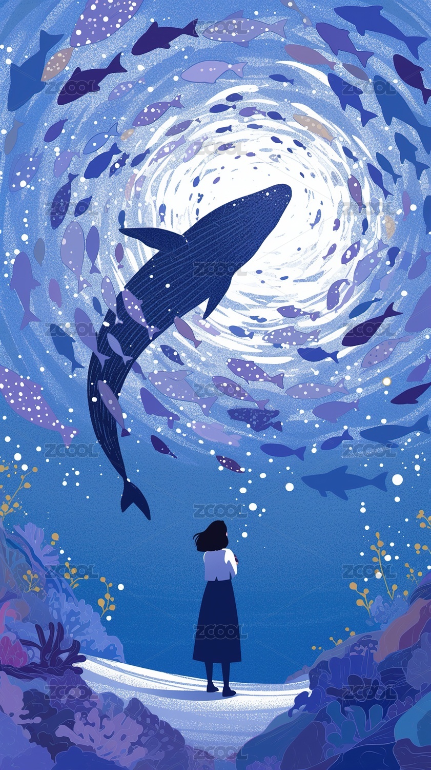 在女孩的梦里鲸鱼和鱼群从天空飞向她身边
