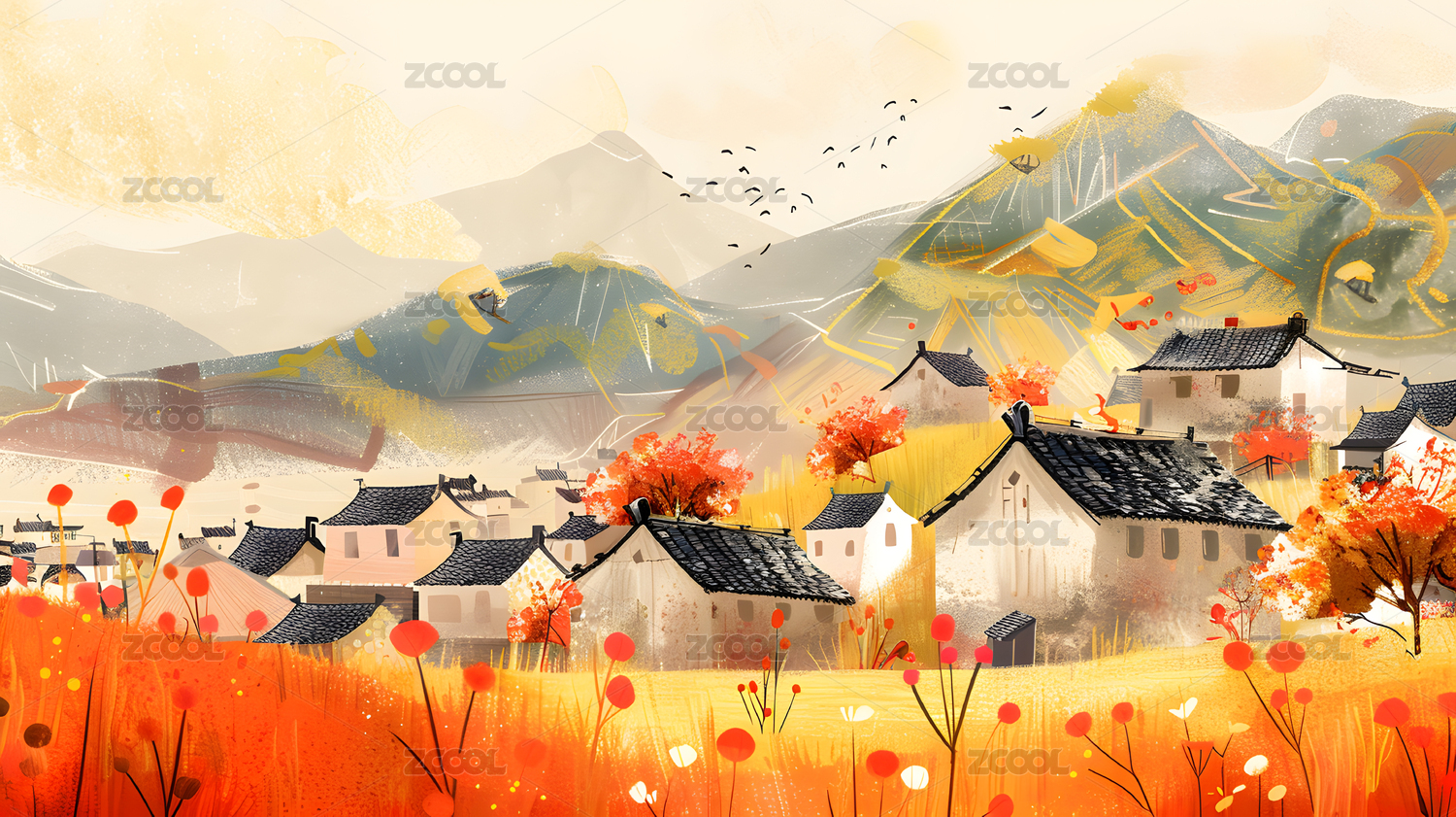 插画,手绘,自然,和谐,唯美,中国风,风景,中式建筑,云雾,山水