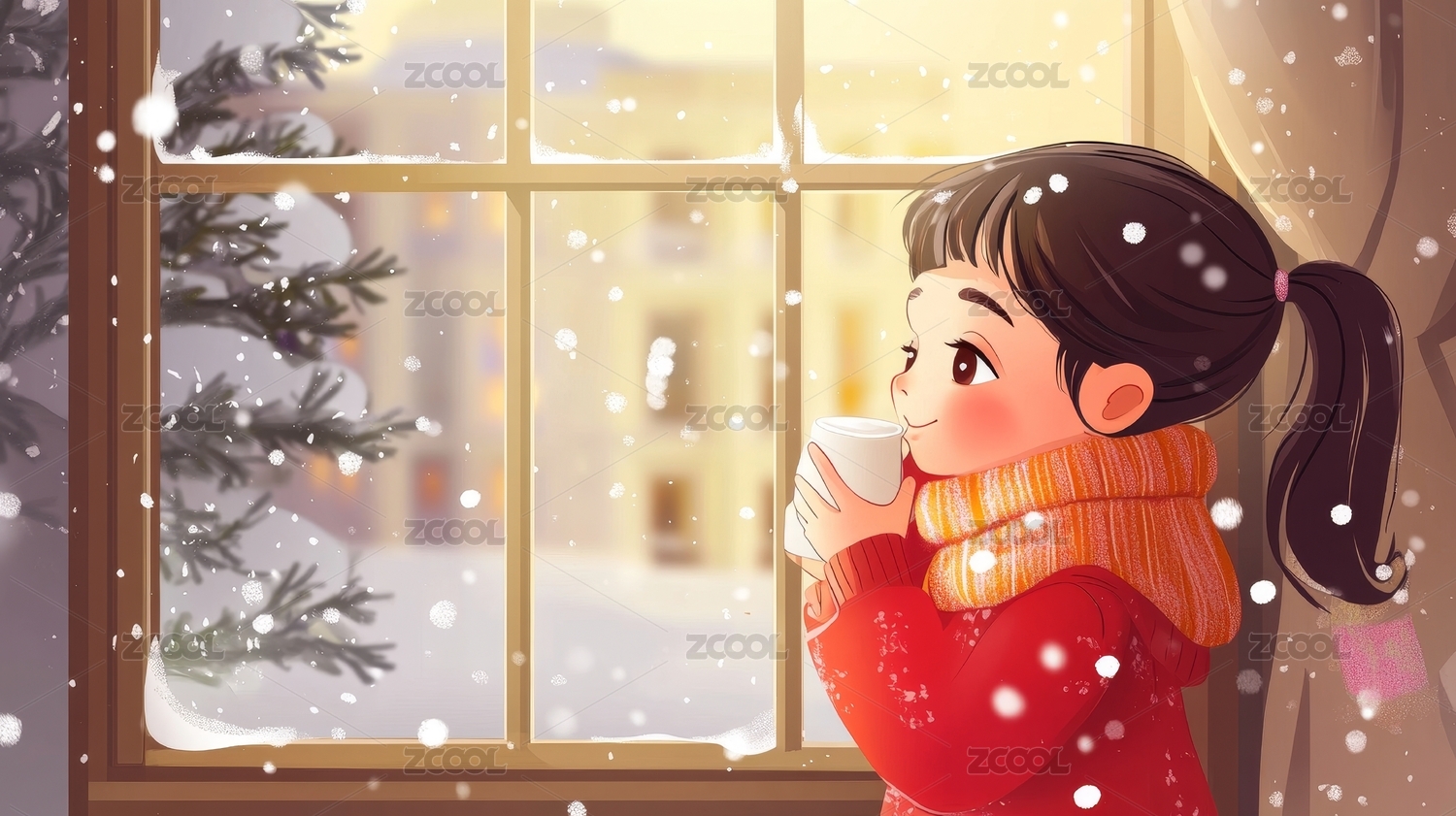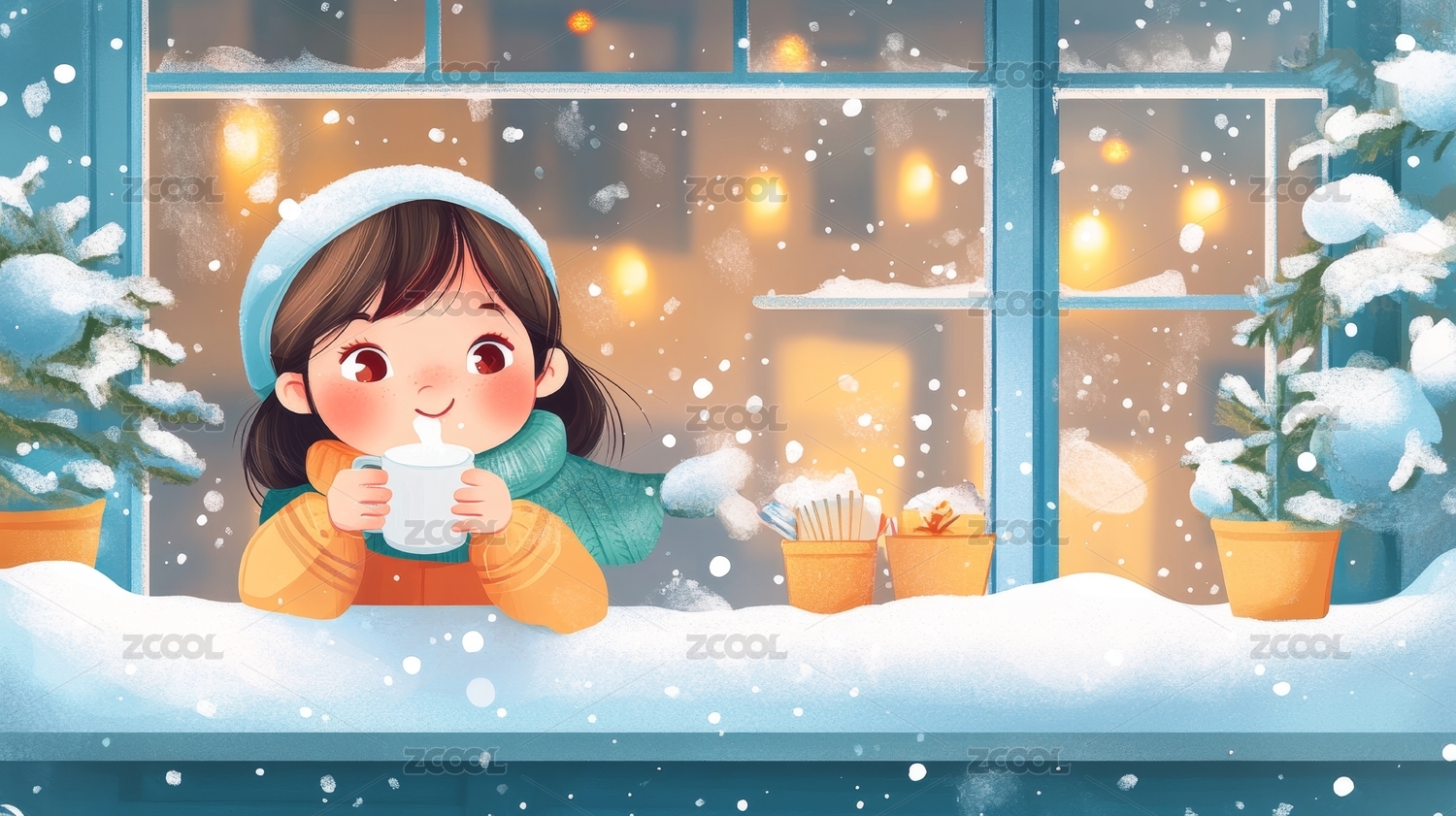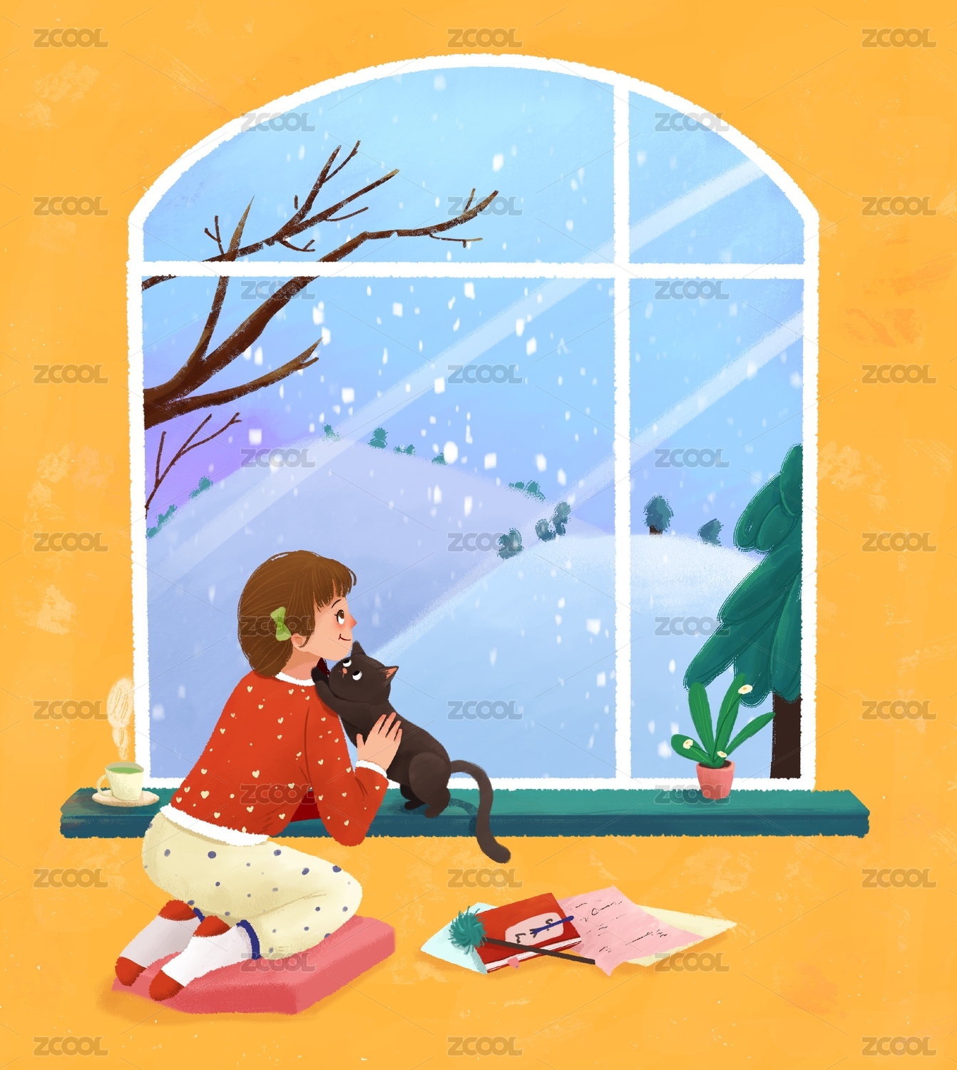 温馨扁平机理风冬天室内女孩和猫看窗外下雪