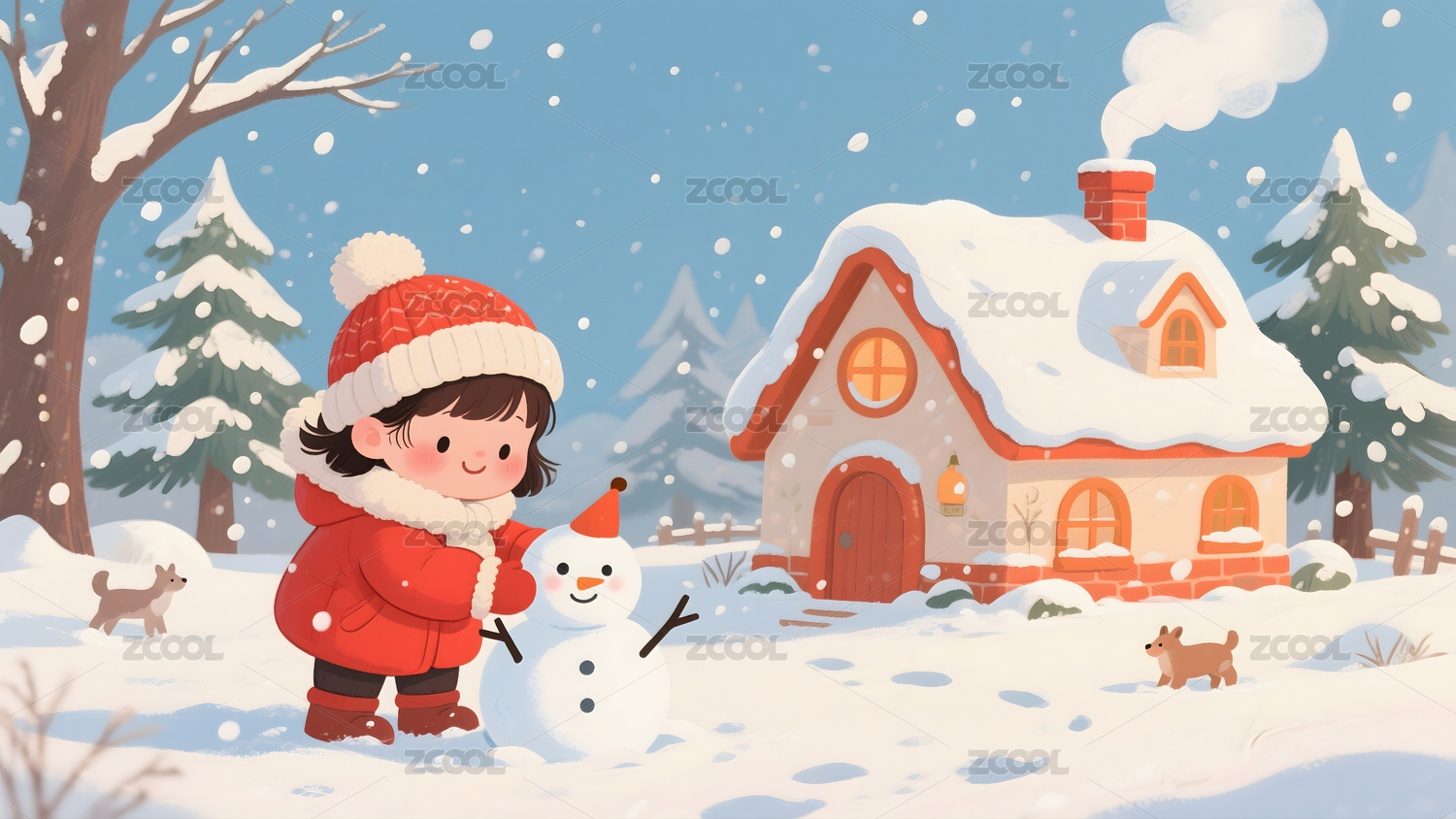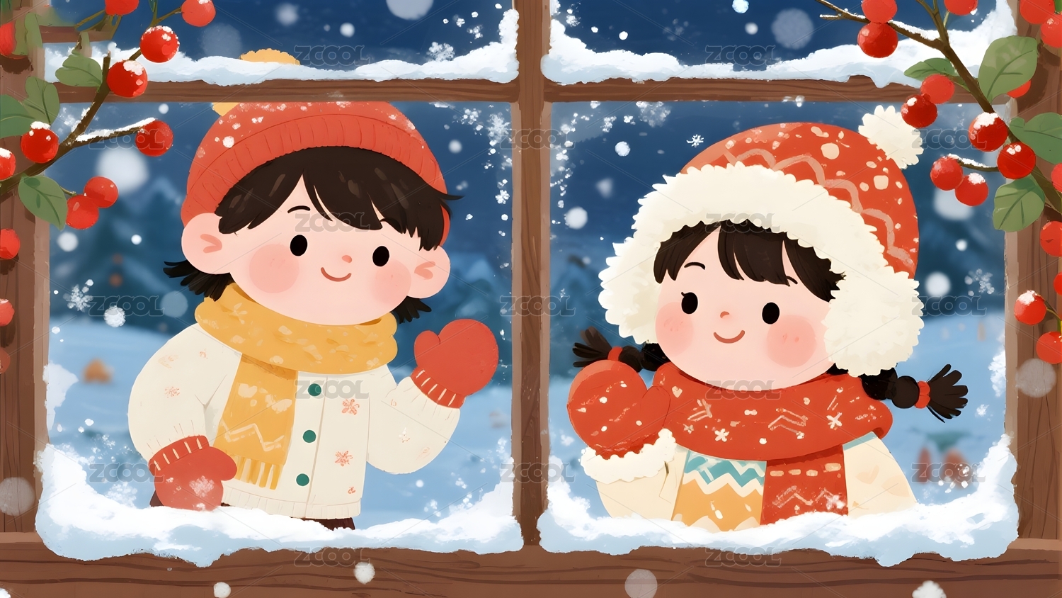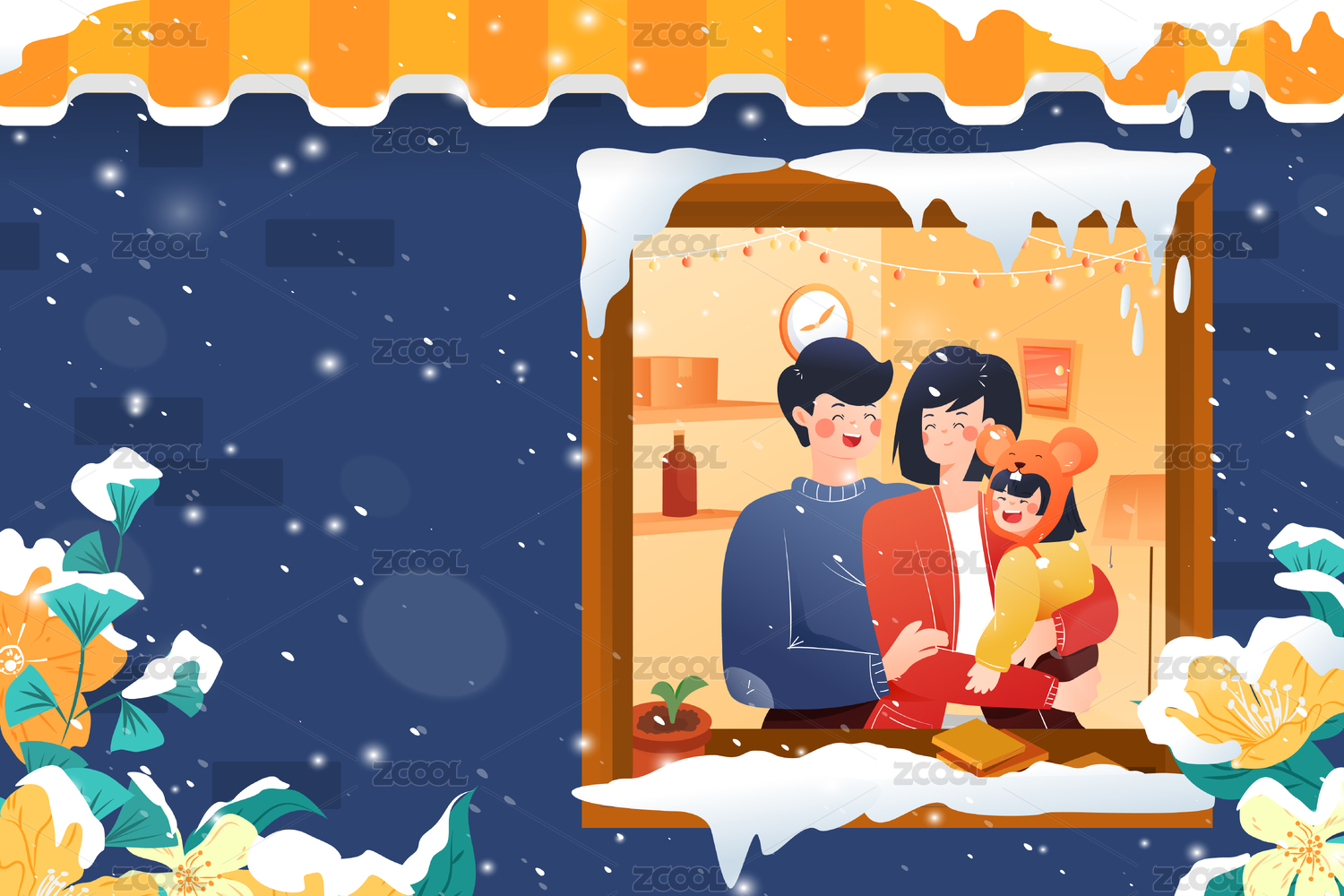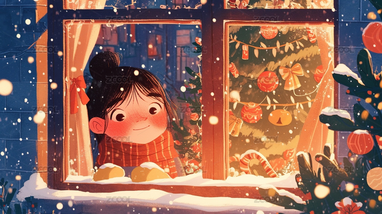 温馨扁平机理风冬天室内女孩和猫看窗外下雪