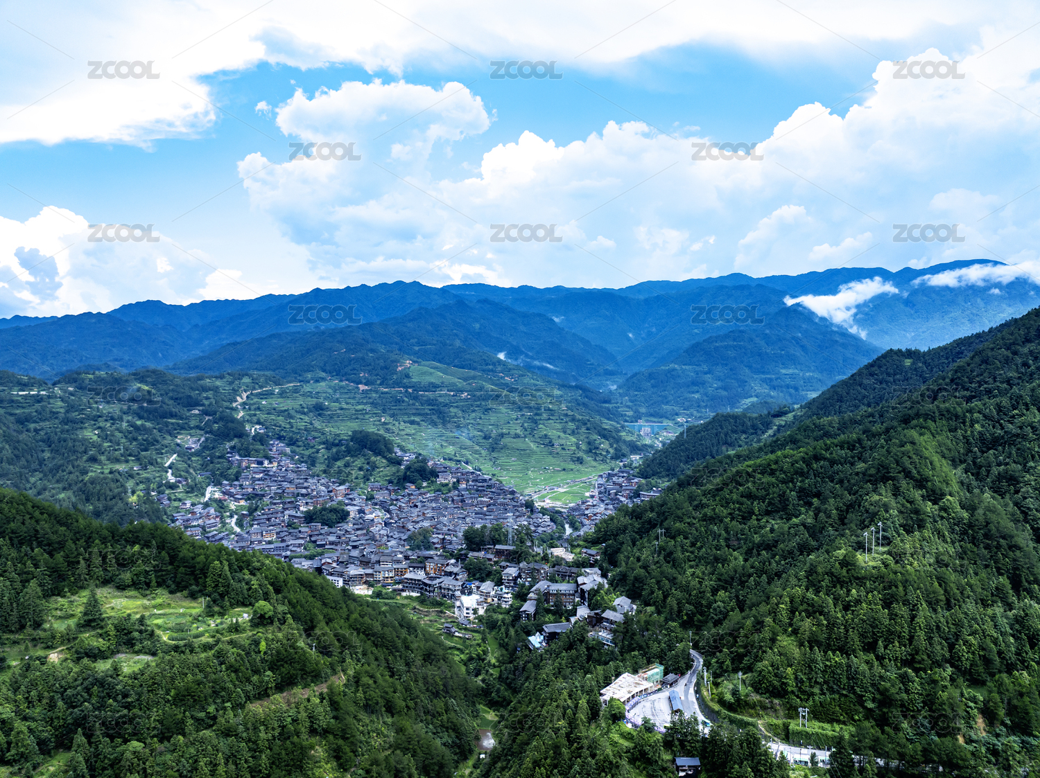 贵州黔东南苗族西江千户苗寨航拍蓝白白云