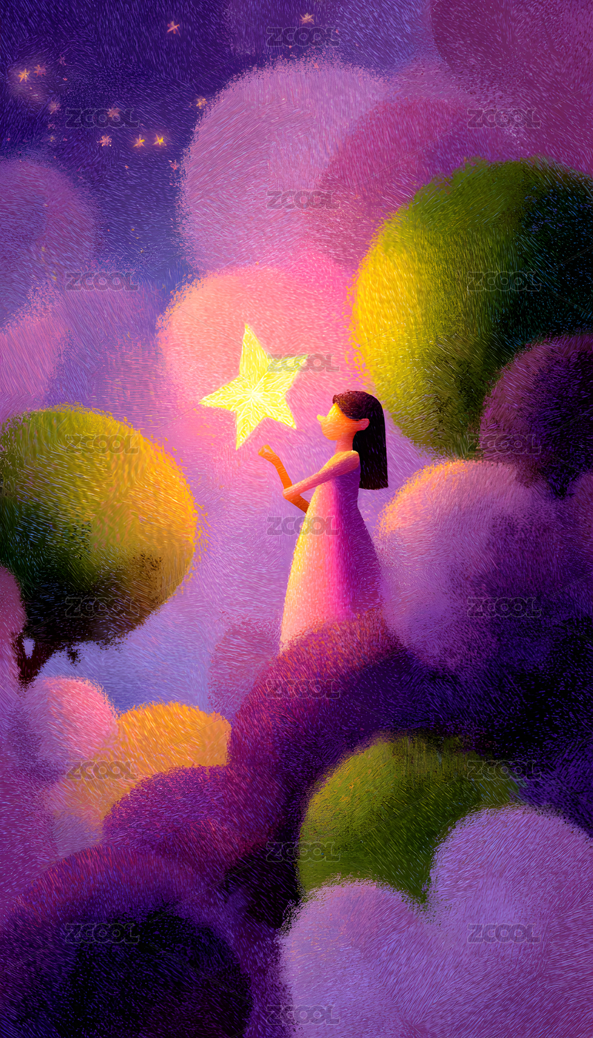 女孩手捧斋灯许愿祈福,头纱化成星空点缀满天星星