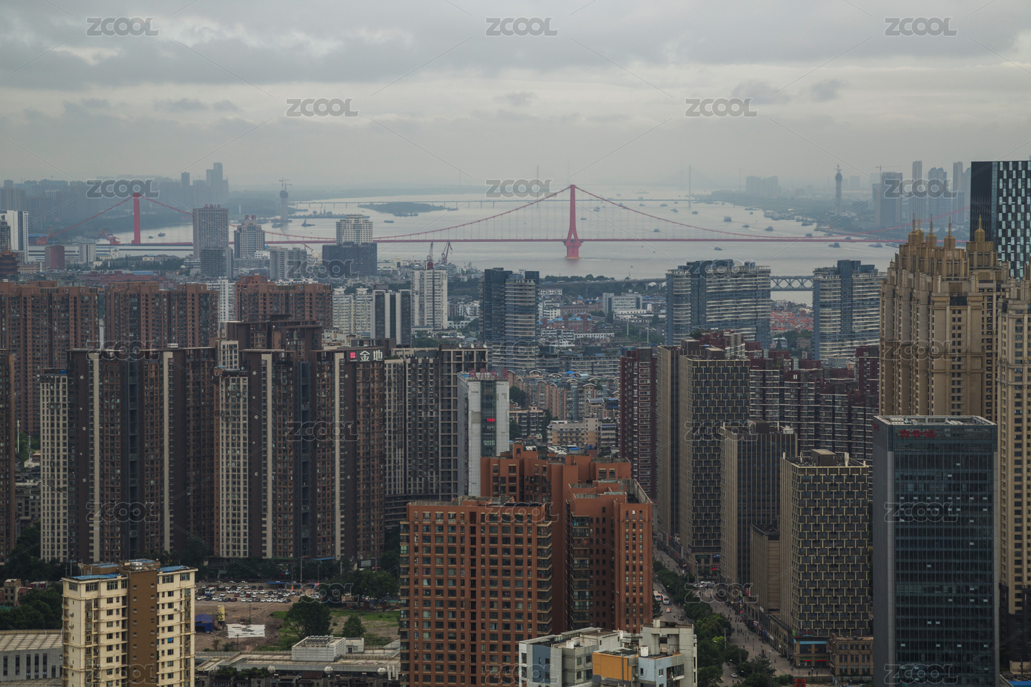中国湖北武汉鹦鹉洲长江大桥和临江建筑群