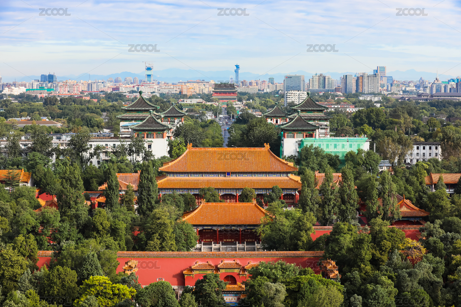 俯瞰北京景山公园寿皇殿中轴线钟楼鼓楼