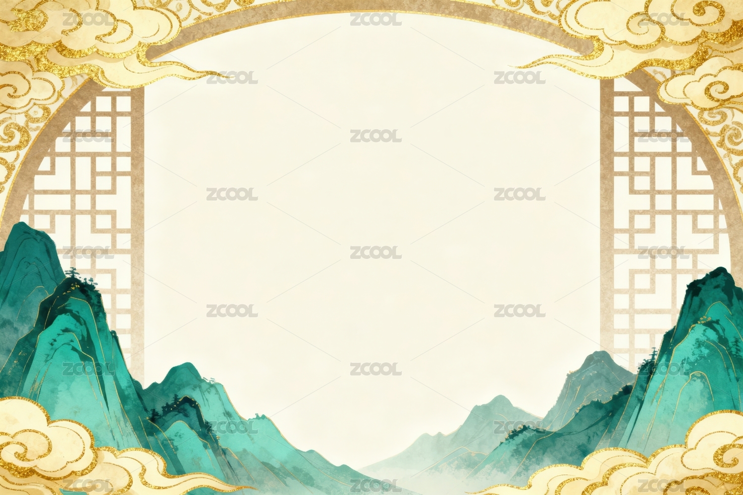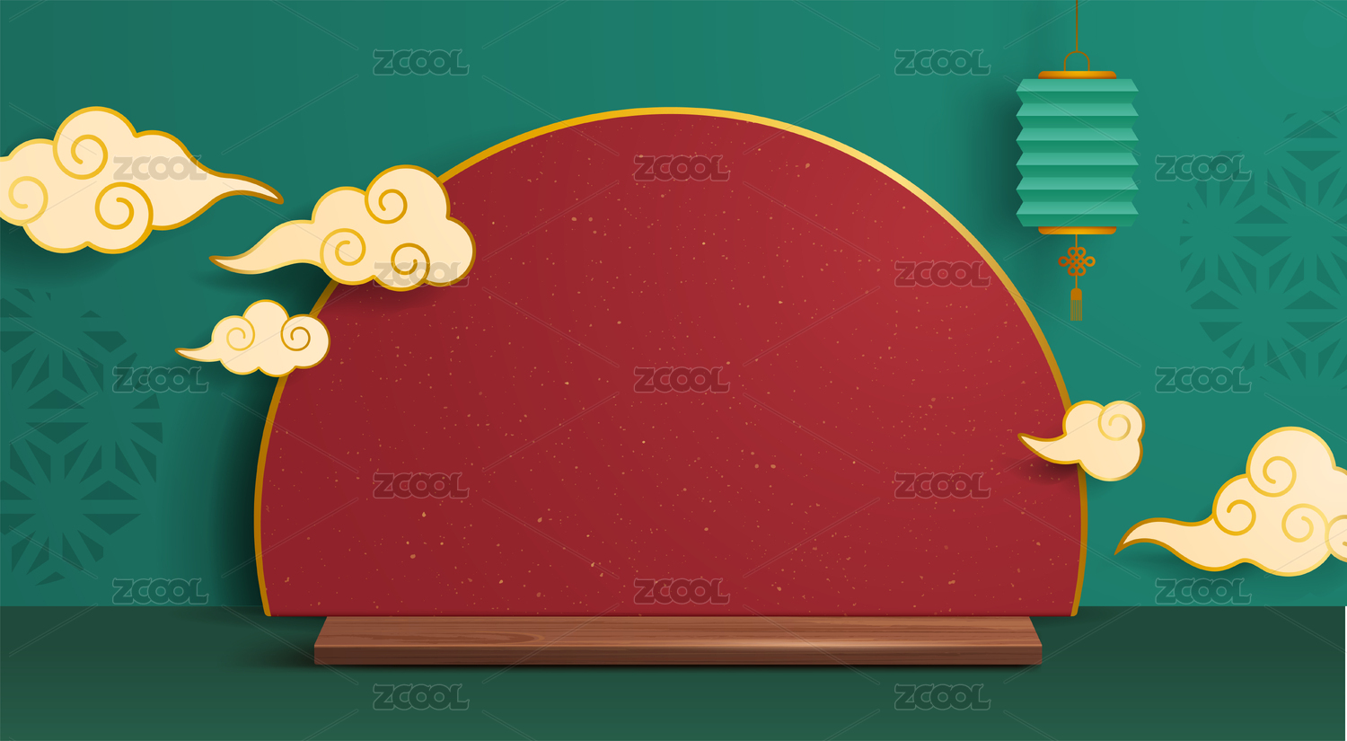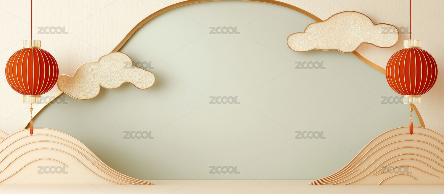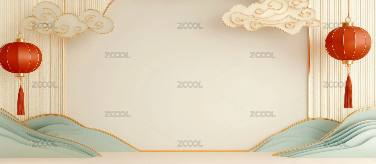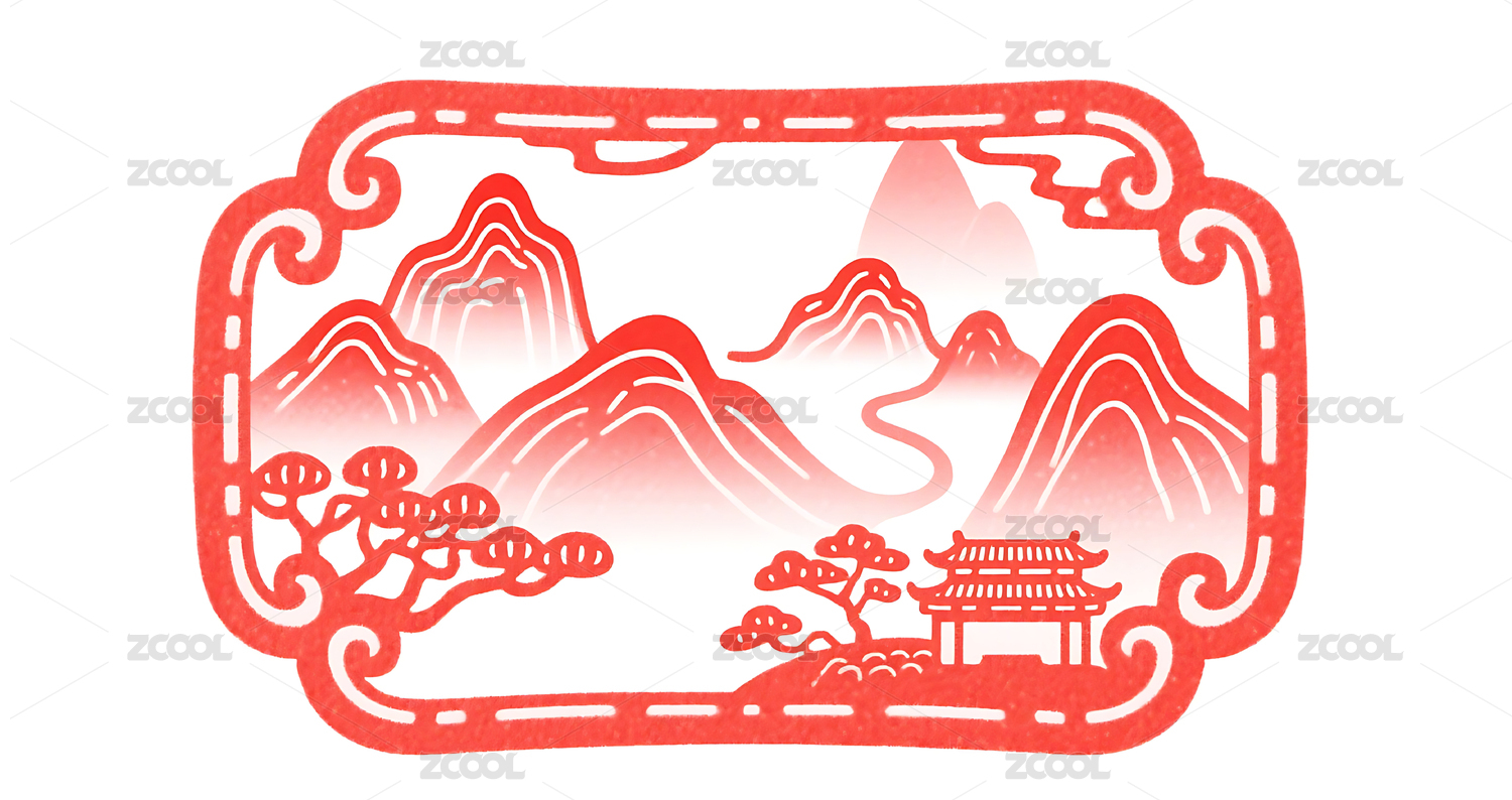 除夕国潮风红灯笼金元宝卷轴山川河流建筑
