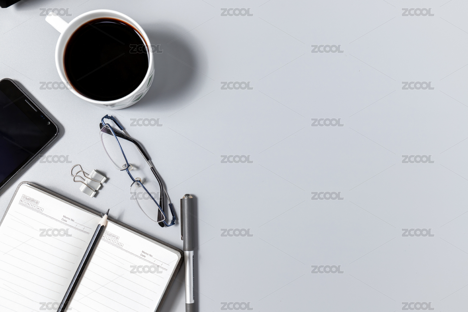 灰色桌面上摆放着手机茶杯和眼镜等静物