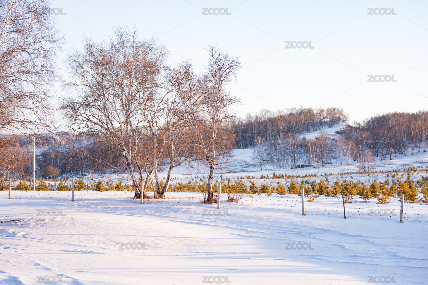 乌兰布统清晨雪地中的白桦