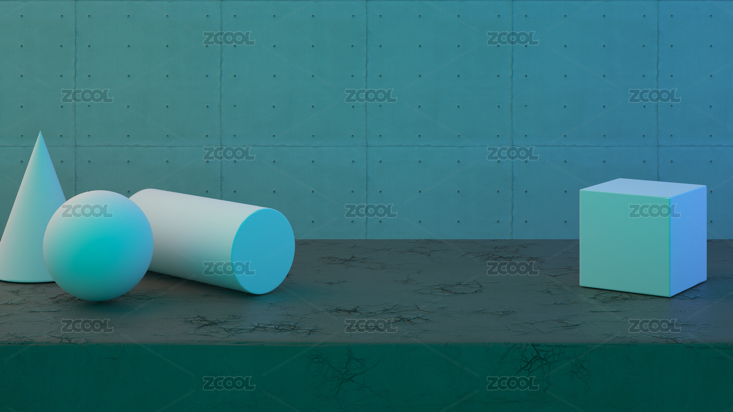 石膏几何体和开裂的地面、混凝土墙面,3d渲染