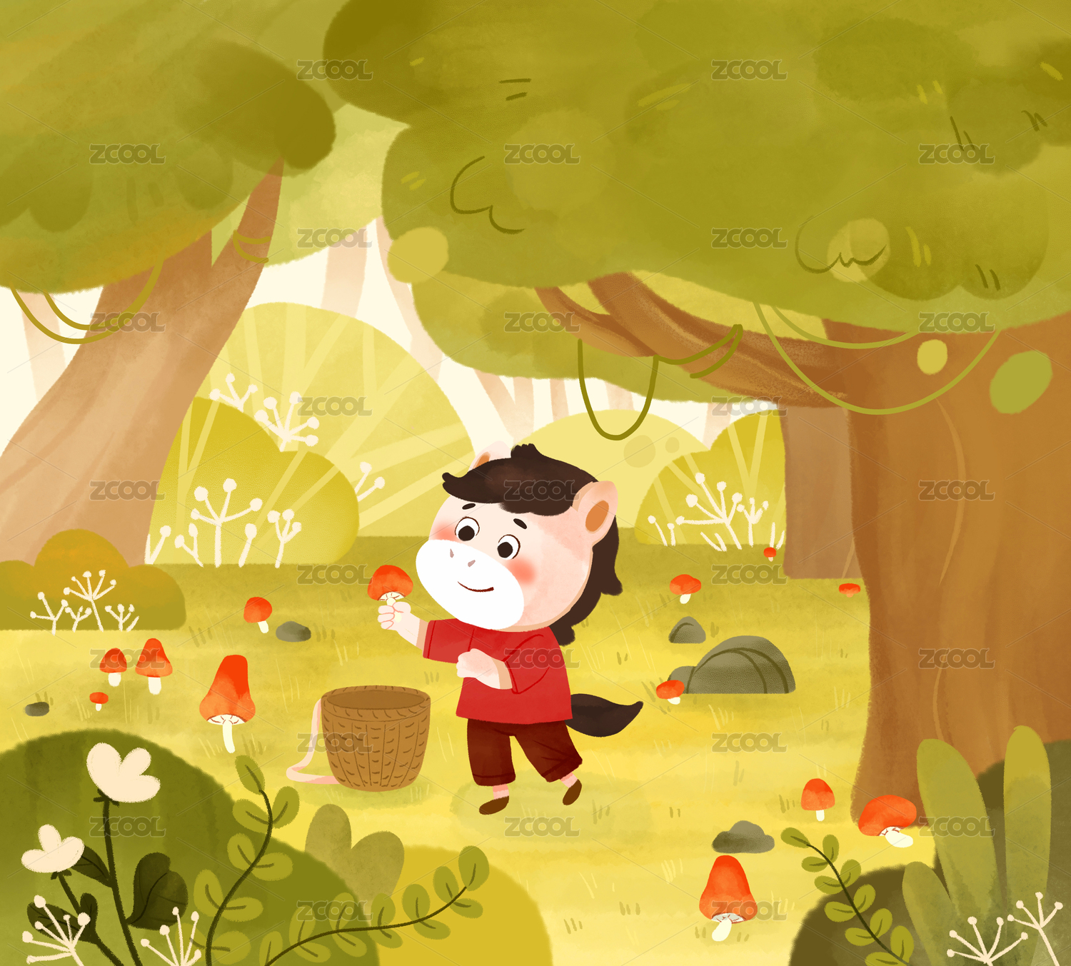 男孩和松鼠坐恐龙摘水果橙子儿童绘本插画
