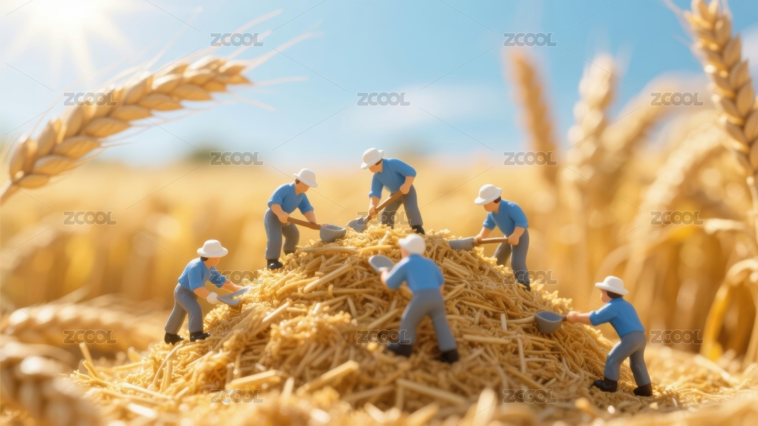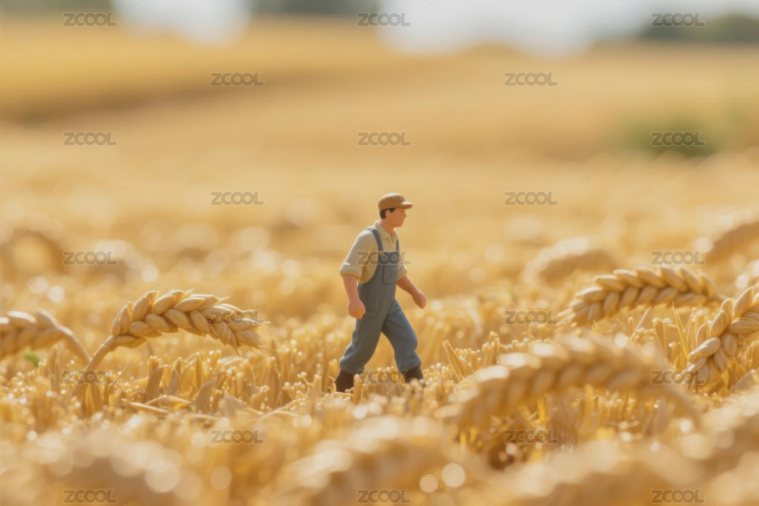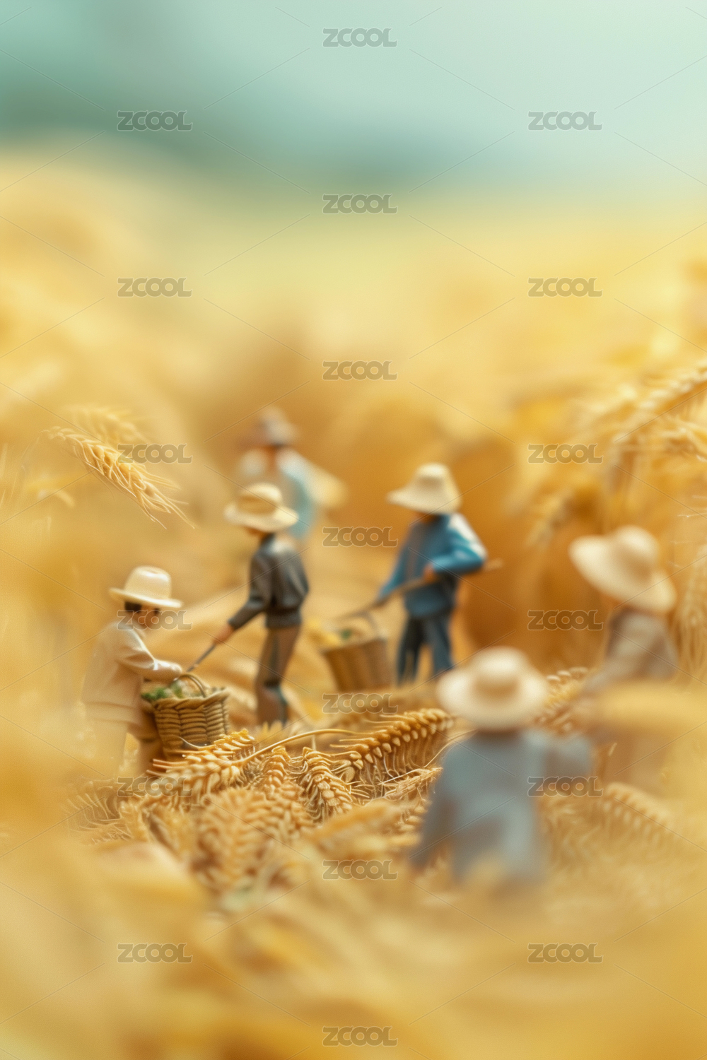 农民伯伯丰收麦田收割场景微型景观摄影海报