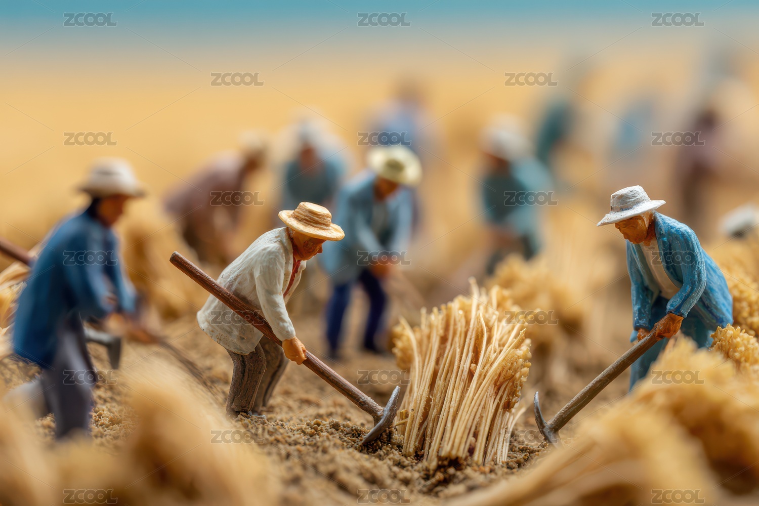 秋天金色稻谷麦田中收庄稼的农民微缩模型