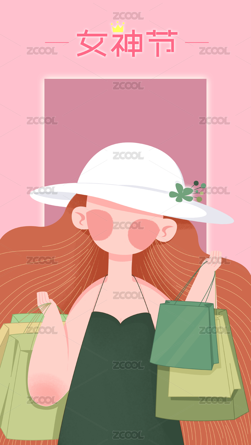 女神节之戴白色帽子的女孩手提购物袋