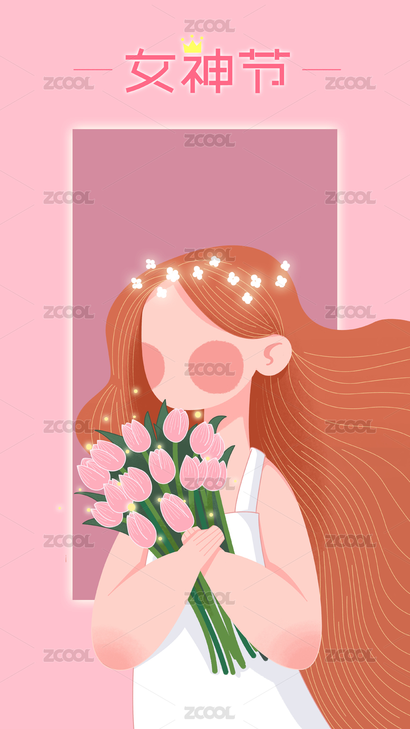 女神节之头戴花饰的女孩手捧鲜花