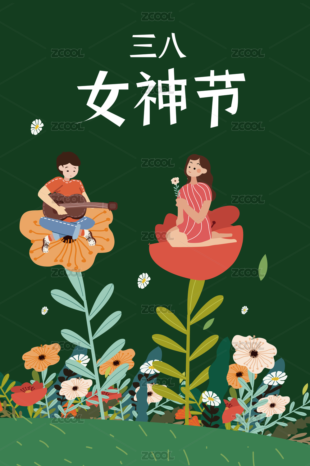 一个女生坐在花丛中的妇女节插画