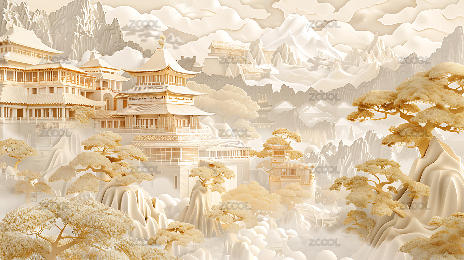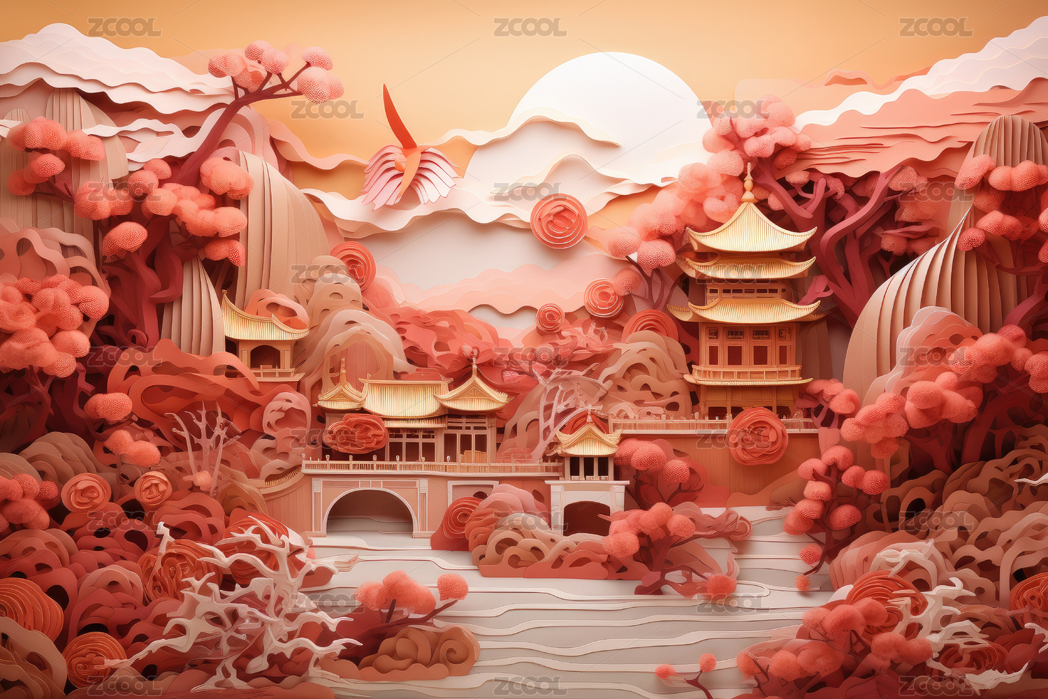 剪纸,中国风,插画,山水画,春节,剪切或撕裂纸张,建筑结构,亭台楼阁,AI数字艺术,装饰