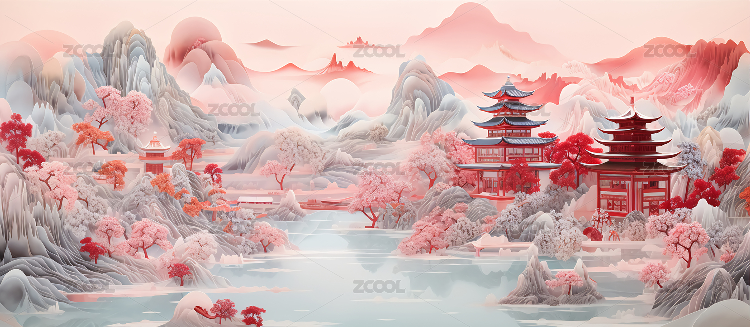 剪纸风格中国风红色剪纸山水古建筑风景画