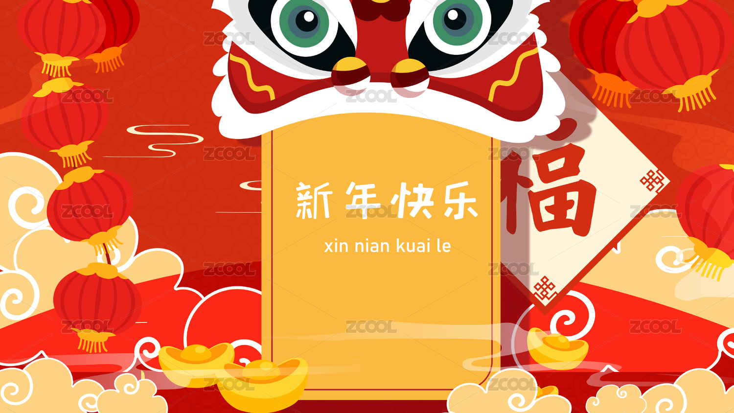 中国传统窗户设计和春联,悬挂的灯笼和祥云