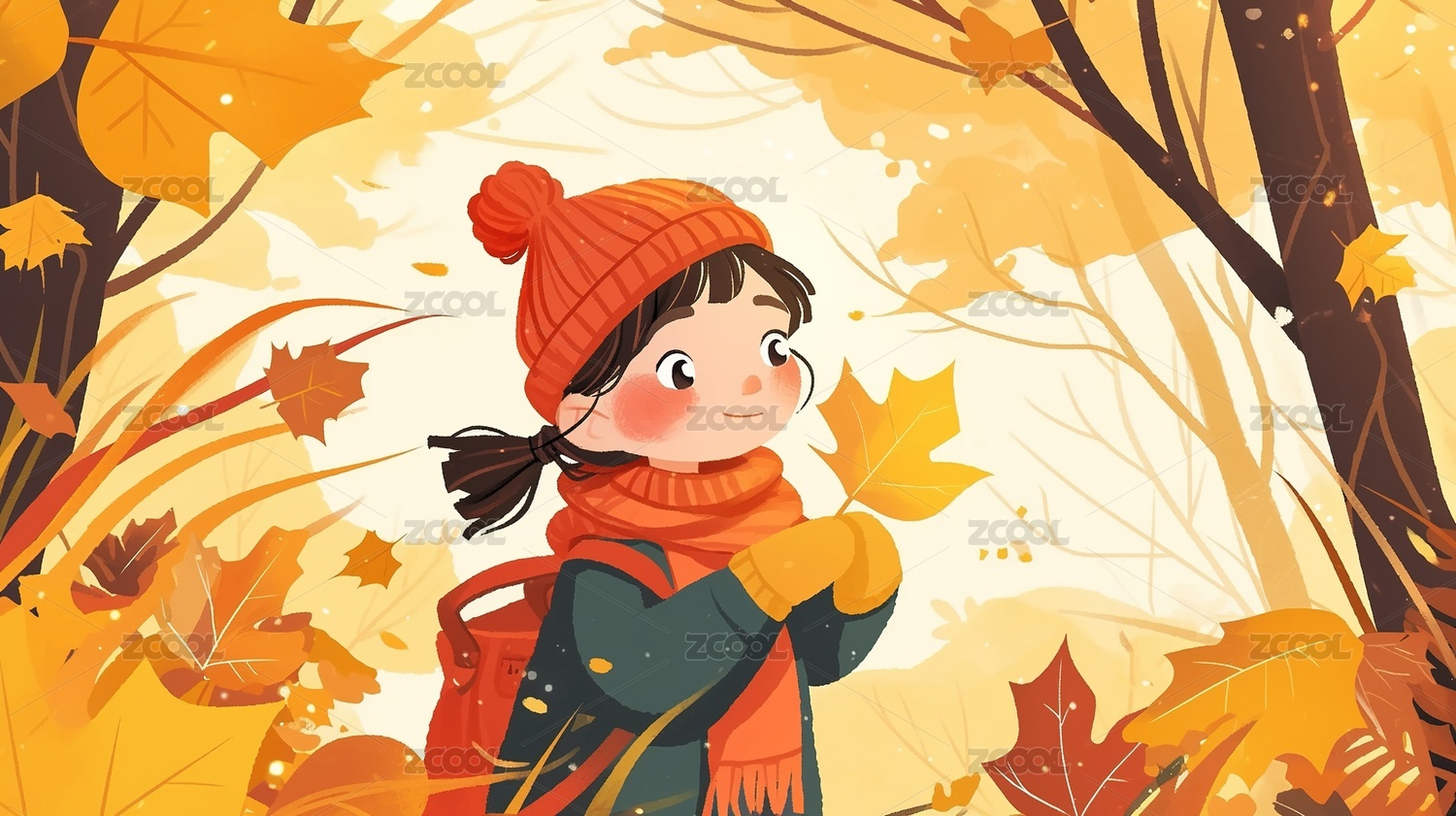 戴帽女孩秋叶飘落景