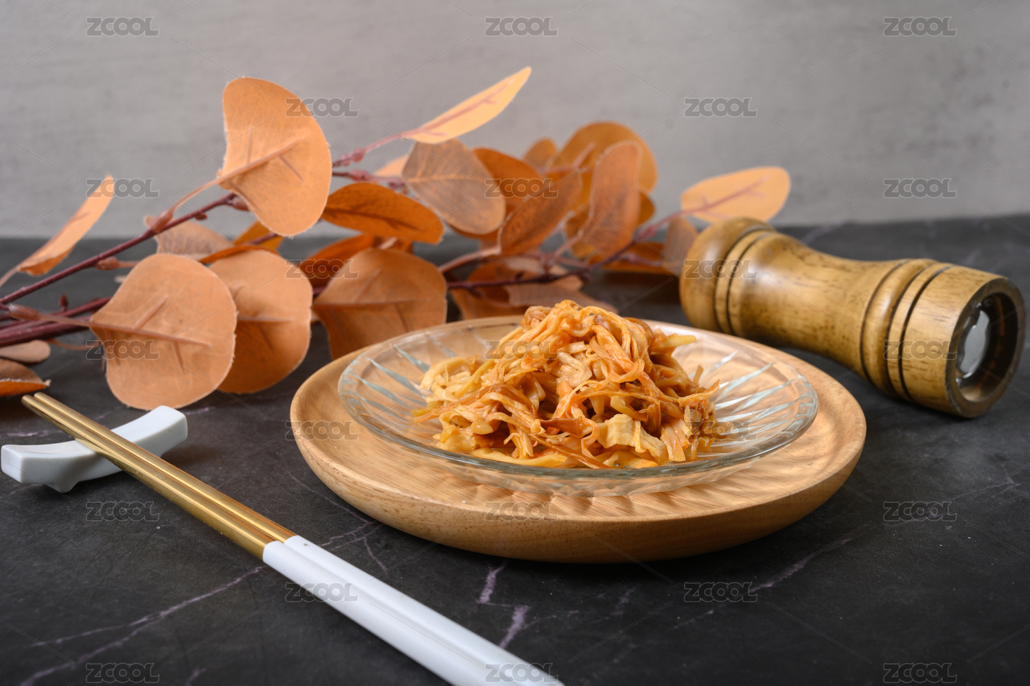 桌面上的盘子里的美味可口的泡发开的豆筋丁