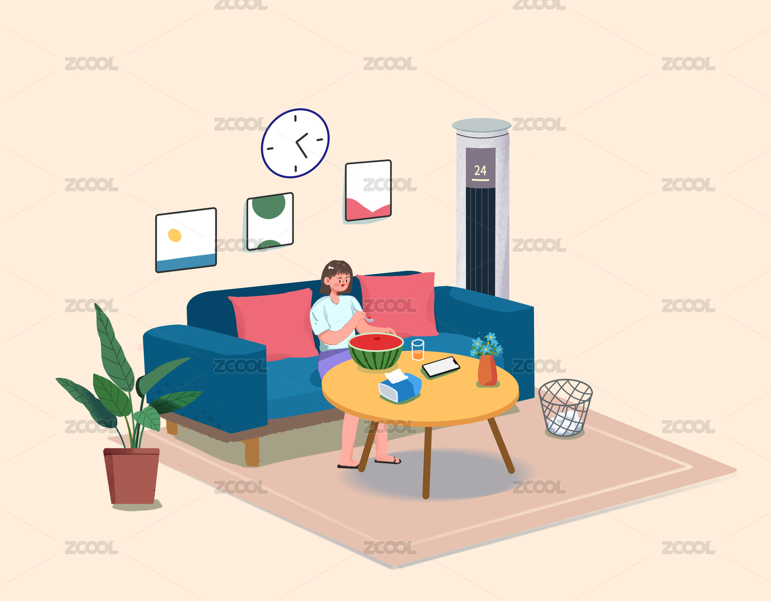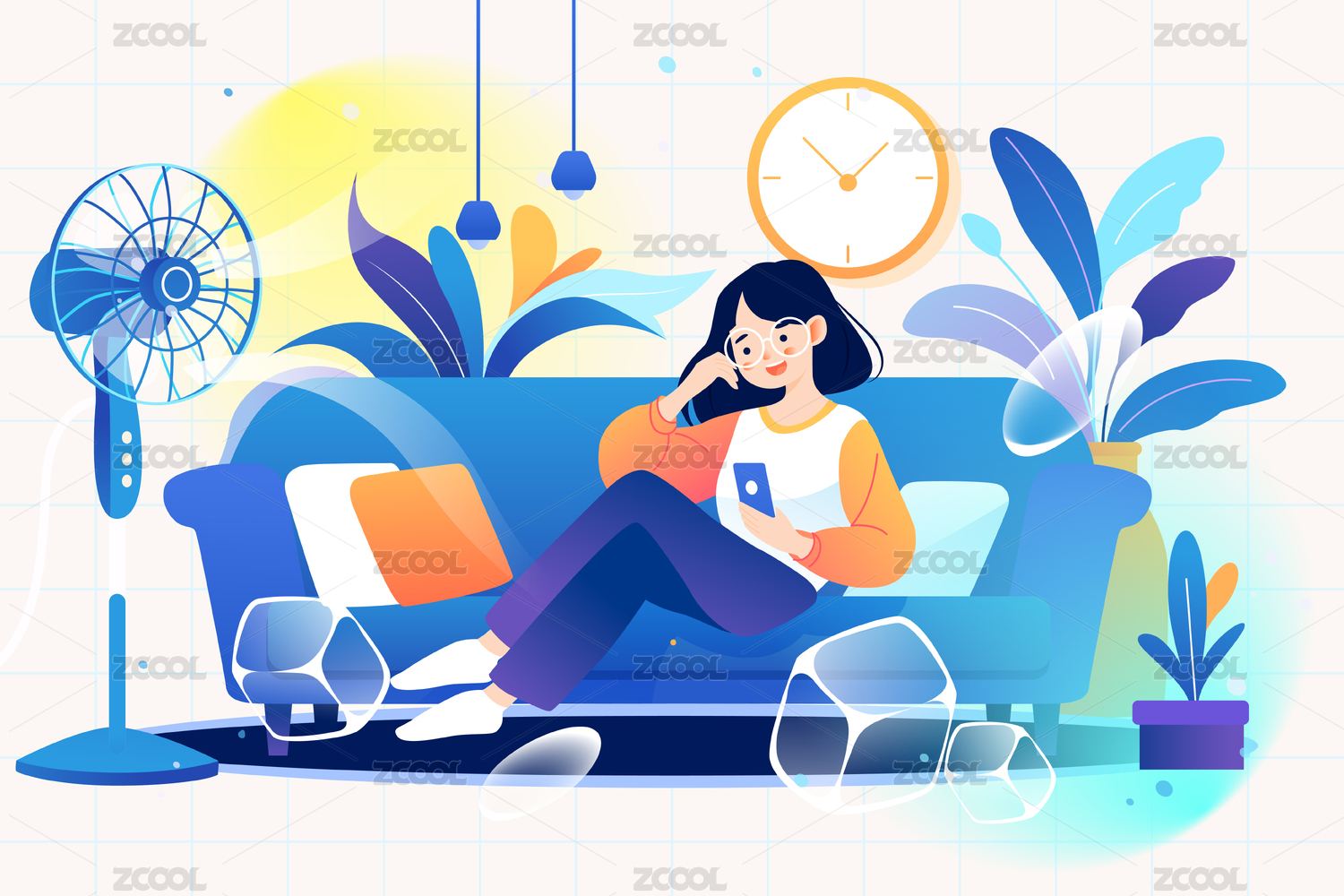 炎热夏天室内吹空调三伏天避暑预防中暑插画