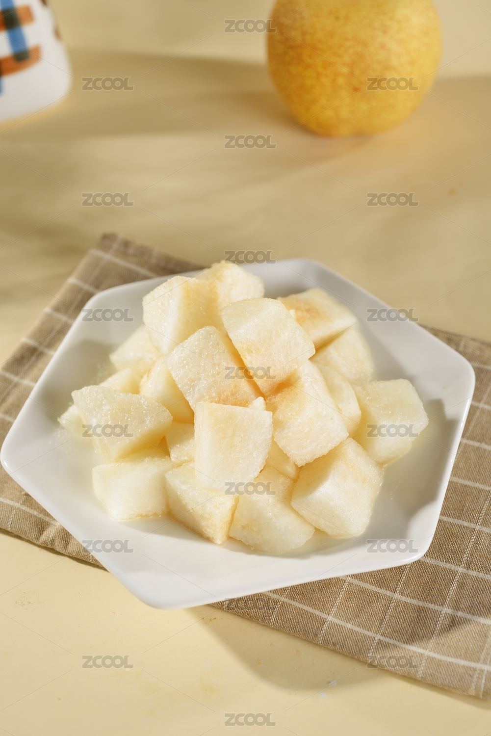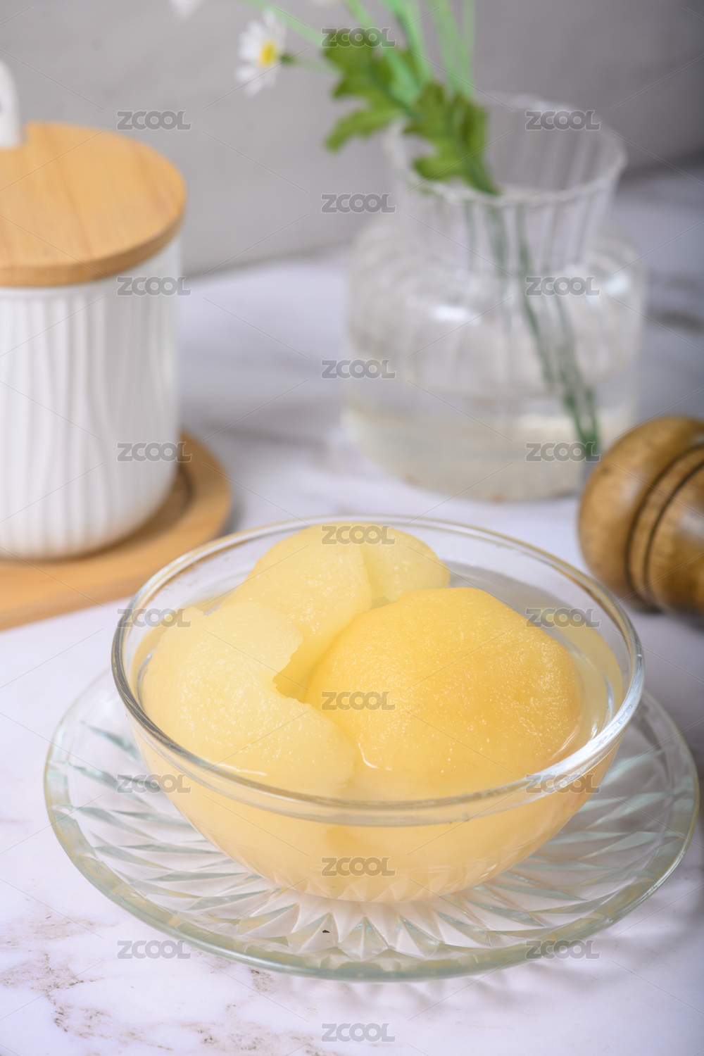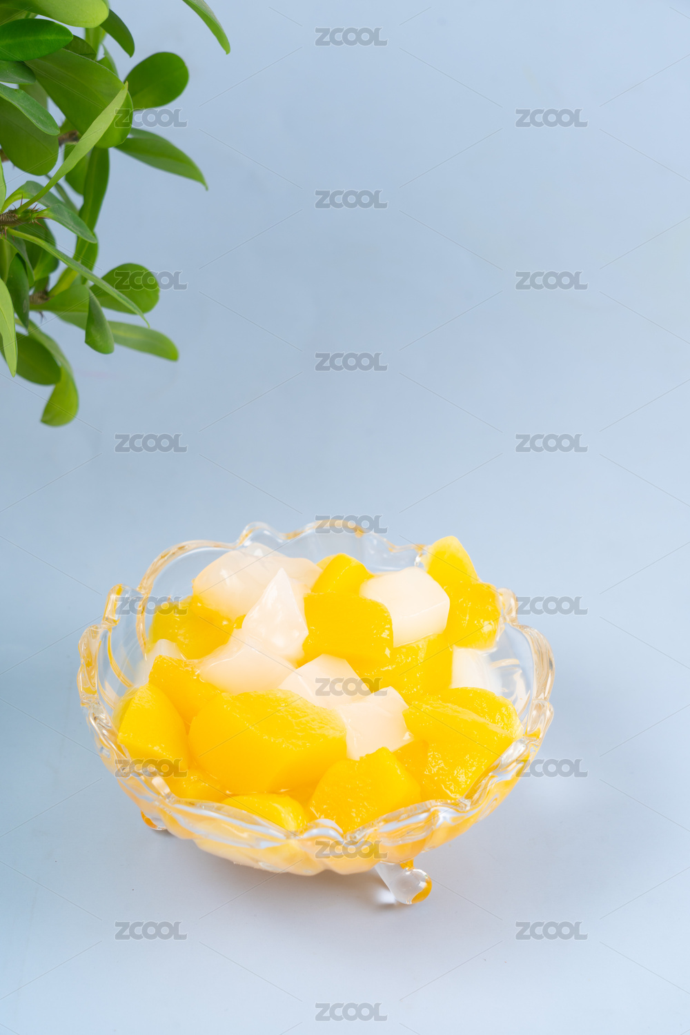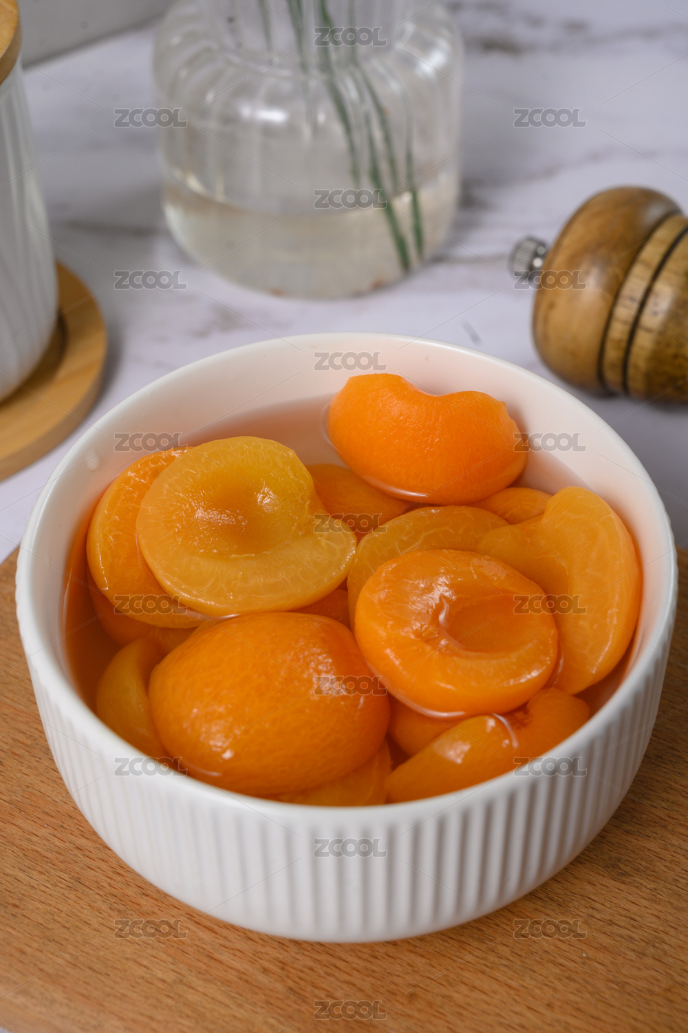 桌面上摆放着一碗下午茶甜品美食黄桃罐头